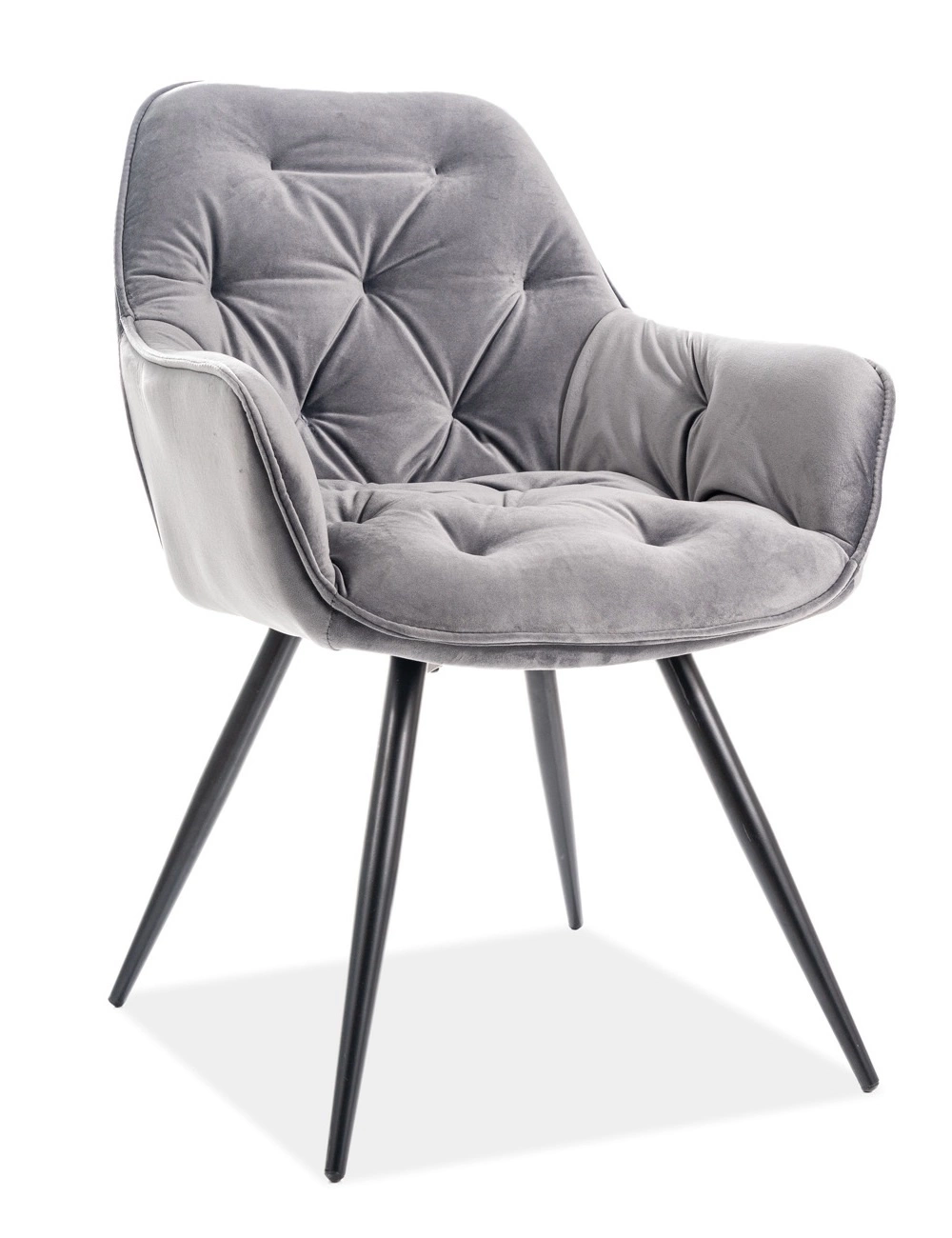 - Krzesło tapicerowane Cherry w kolorze szarym to przepis na funkcjonalne wnętrze w Twoim domu! Nowoczesne krzesło ma metalowe, czarne nogi w kształcie stożka. Dla zwiększenia komfortu krzesło posiada wygodne oparcie oraz miękkie podłokietniki.