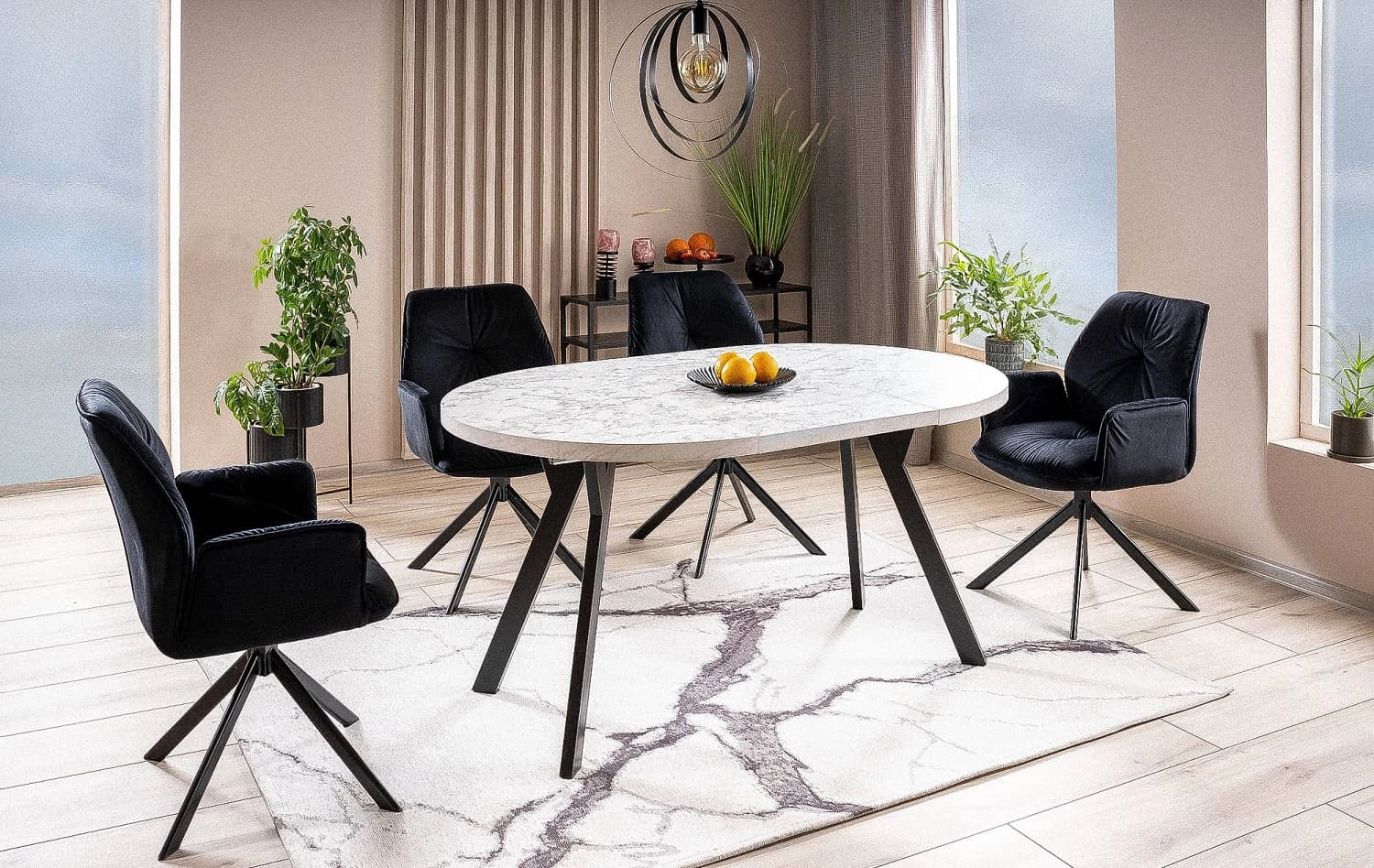 Idealnie wpasuje się w obecne trendy wnętrzarskie. Zestawienie kolorowej tkaniny z czarnymi nogami nadaje całości finezji i charakteru. Krzesło zostało pokryte tkaniną Bluvel, która jest bardzo miękka i przyjemna w dotyku. Tkaninę wyróżnia aksamitna, połyskująca w świetle powierzchnia. Zastosowana tkanina wykazuje wysoką odporność na zaciągnięcia i zadrapania. Dodatkowo jest trudnopalna. Dzięki właściwościom tkaniny krzesło obrotowe Boogie II przez długi czas zachowa swój nieskazitelny wygląd. Świetnie sprawdzi się jako krzesło do salonu, a także krzesło do jadalni.