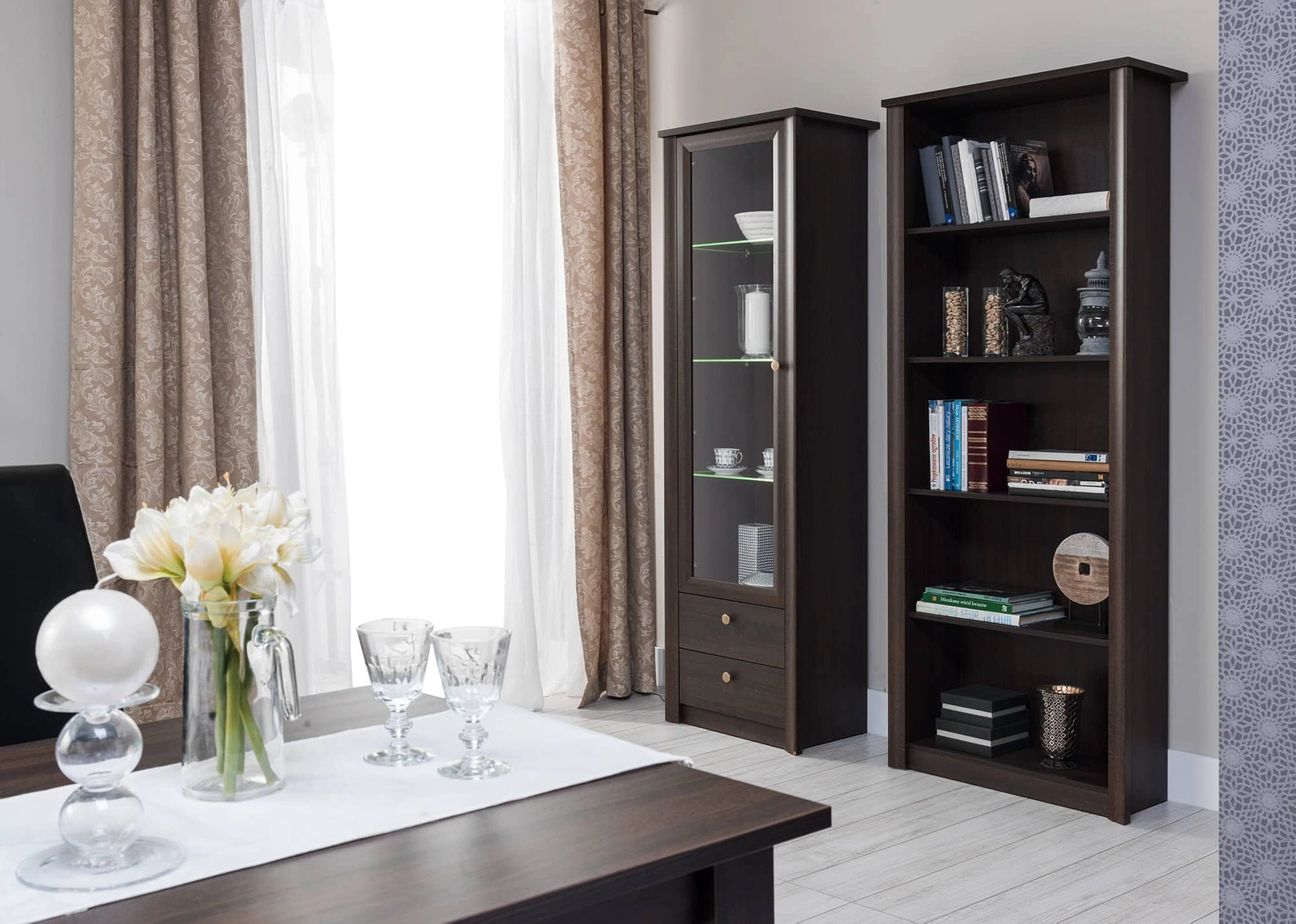 Regał Finezja w kolorze dąb sonoma czekolada to przepis na stylowe oraz funkcjonalne wnętrze w pokoju dziennego oraz biura.