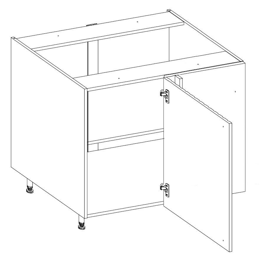 Półka nie jest przykręcona do korpusu szafki kuchennej, dzięki czemu można ją wyciągnąć i uzyskać miejsce na wysokie przedmioty. W szafce kuchennej można zamontować różnego typu rozwiązania ułatwiające codzienne użytkowanie np. kosz cargo, półki obrotowe, karuzele. Szafka kuchenna jest wyposażona w nogi, których wysokość można regulować.