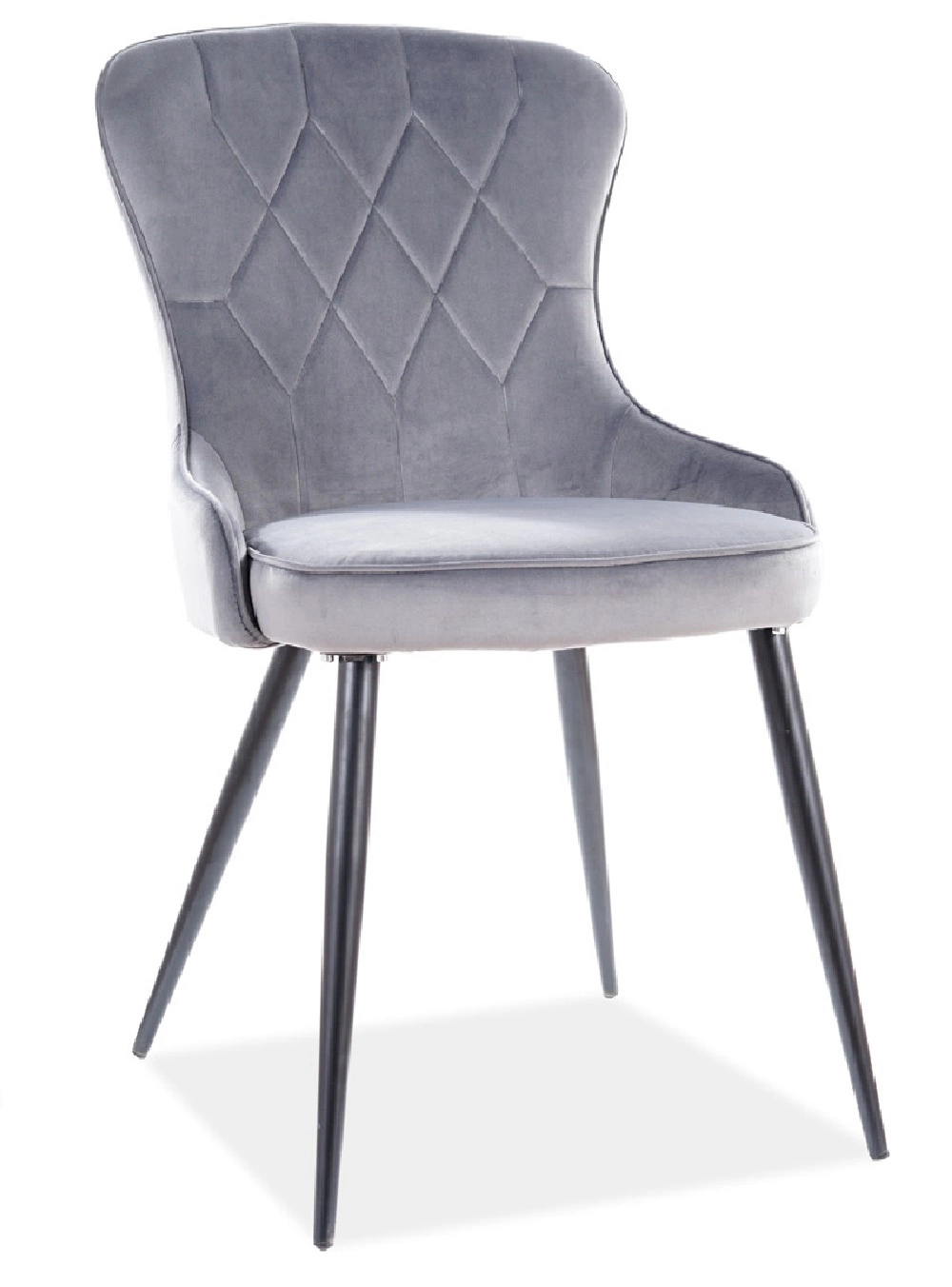 Nowoczesne krzesło obite stylową tkaniną posiada metalowe nogi w kolorze czarnym.