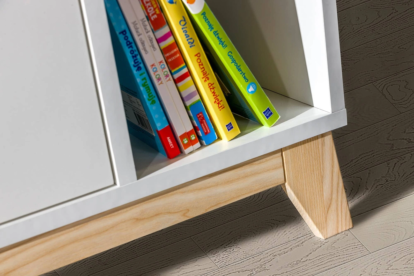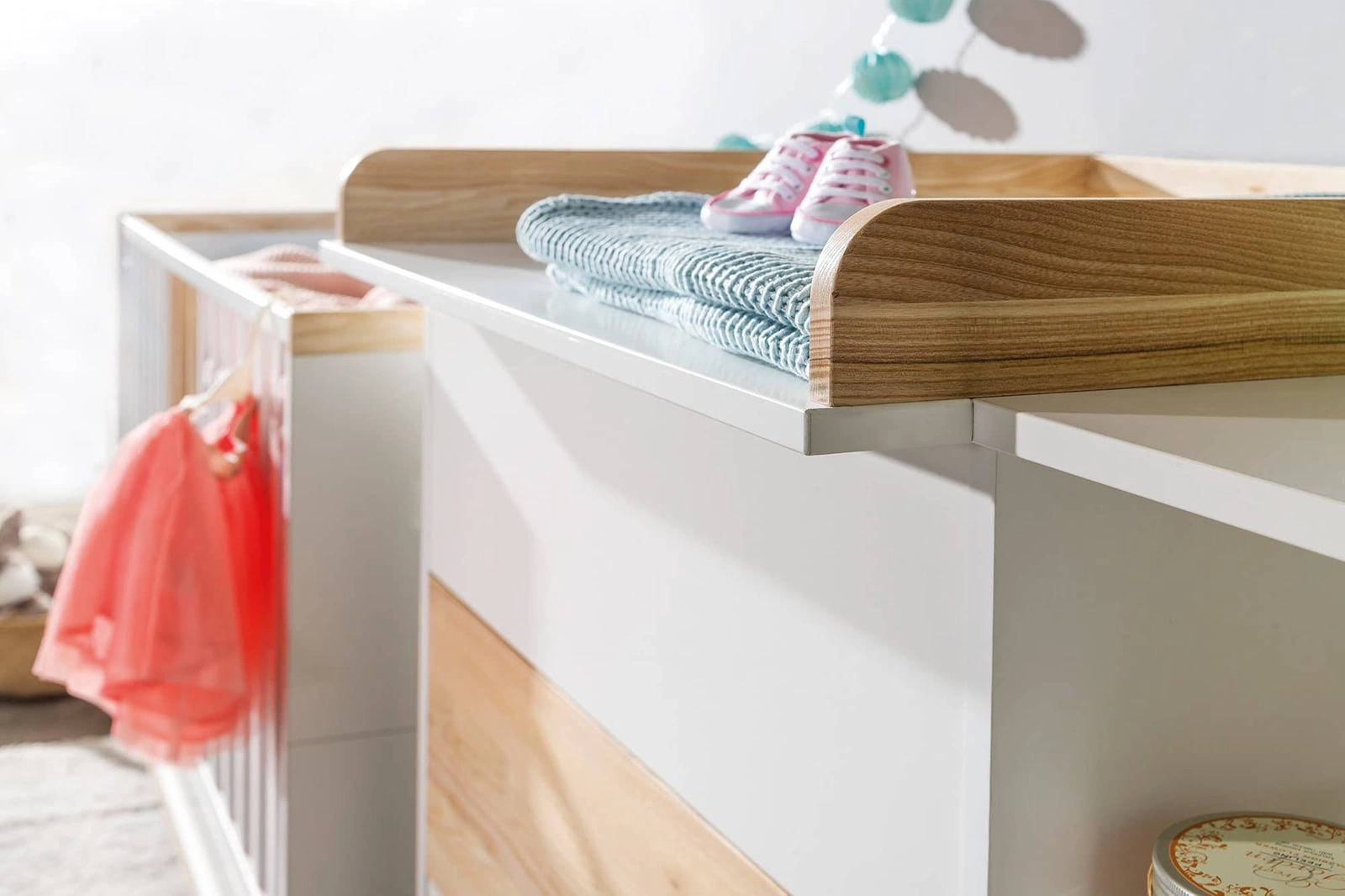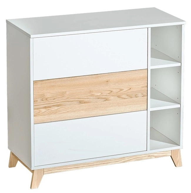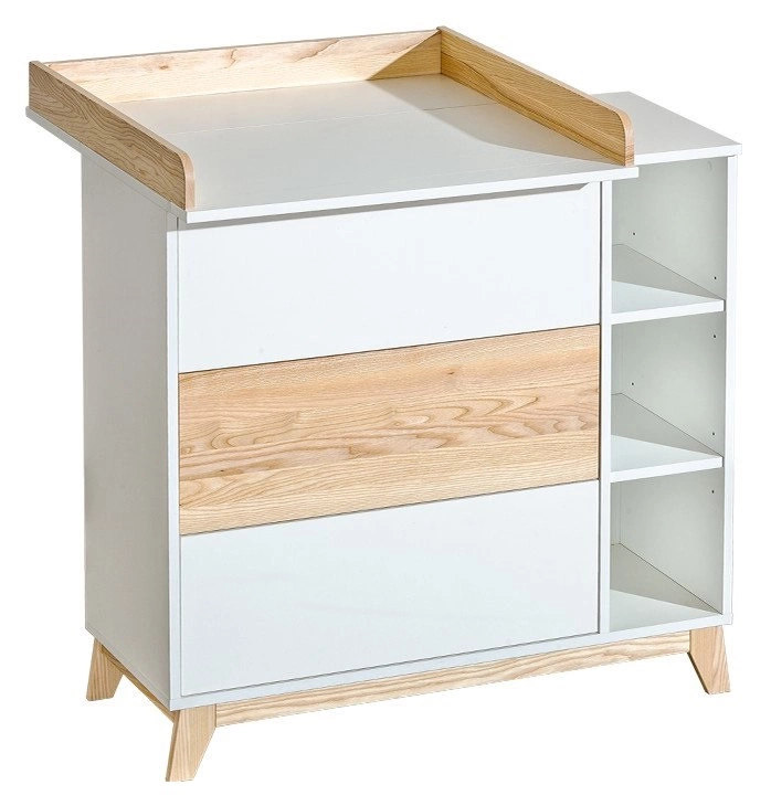 Komoda skonstruowana jest z 3 szuflad, półek otwartych oraz przewijaka montowanego na blacie komody. Przewijak można zamontować po prawej lub po lewej stronie komody. Komoda posiada możliwość demontażu przewijaka w dowolnym momencie, tworząc stylowy i użytkowy mebel w pokoju dla starszego dziecka. Fronty w kolorze ponadczasowej bieli zostały przełamane wstawkami z drewna jesionowego. Konstrukcję mebla wzmocniono drewnianymi nogami w stylu skandynawskim.