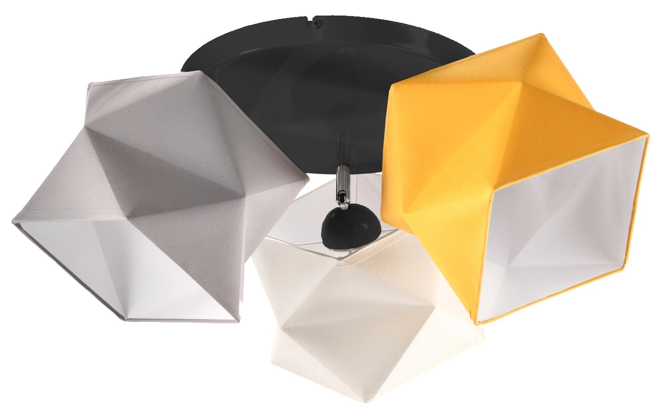 Lampy z kolekcji Quasar wyróżniają się nietypowym kształtem materiałowych kloszy. Trzy punkty świetlne z powodzeniem rozjaśnią każdą przestrzeń. Abażury w kolorze szarym, musztardowym oraz białym zostały powieszone na czarnej podstawie. Dzięki wyrazistej kolorystyce plafon sufitowy sprawdzi się w pomieszczeniach w stylu nowoczesnym jak i klasycznym z wykorzystaniem odważnych elementów dekoracyjnych.