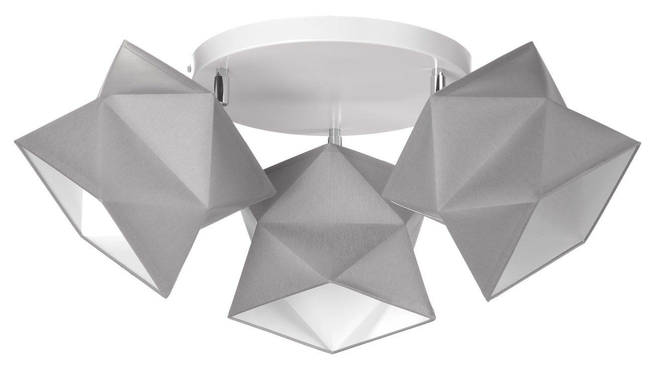 Lampy z kolekcji Quasar wyróżniają się nietypowym kształtem materiałowych kloszy. Trzy punkty świetlne z powodzeniem rozjaśnią każdą przestrzeń. Szare abażury zostały powieszone na białej podstawie. Dzięki stonowanej kolorystyce plafon sufitowy sprawdzi się w pomieszczeniach w stylu nowoczesnym jak i klasycznym z wykorzystaniem odważnych elementów dekoracyjnych.
