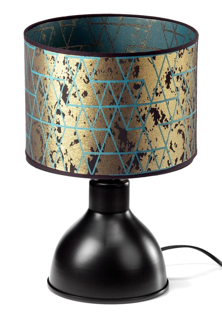 Lampy z kolekcji Wena wyróżniają się stylowymi abażurami, które połyskują drobinkami złotego brokatu. Dodatkowo są zdobione geometrycznym wzorem w kontrastującym, turkusowym kolorze. Oprawa lampy zapewni jasny blask, który z powodzeniem rozjaśni każdą przestrzeń. Walcowaty abażur został przytwierdzony do stabilnej podstawy w kolorze czarnym. Dzięki nietuzinkowej kolorystyce lampka nocna sprawdzi się w pomieszczeniach w stylu nowoczesnym, glamour jak i klasycznym z wykorzystaniem odważnych elementów dekoracyjnych.