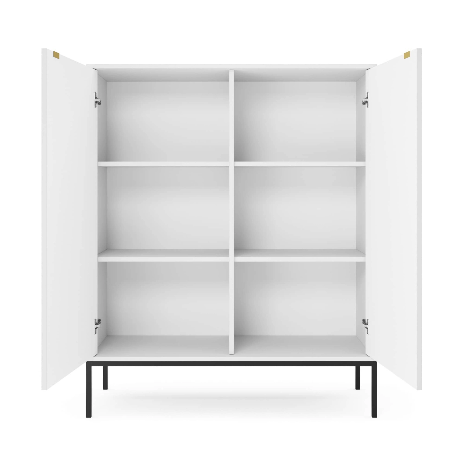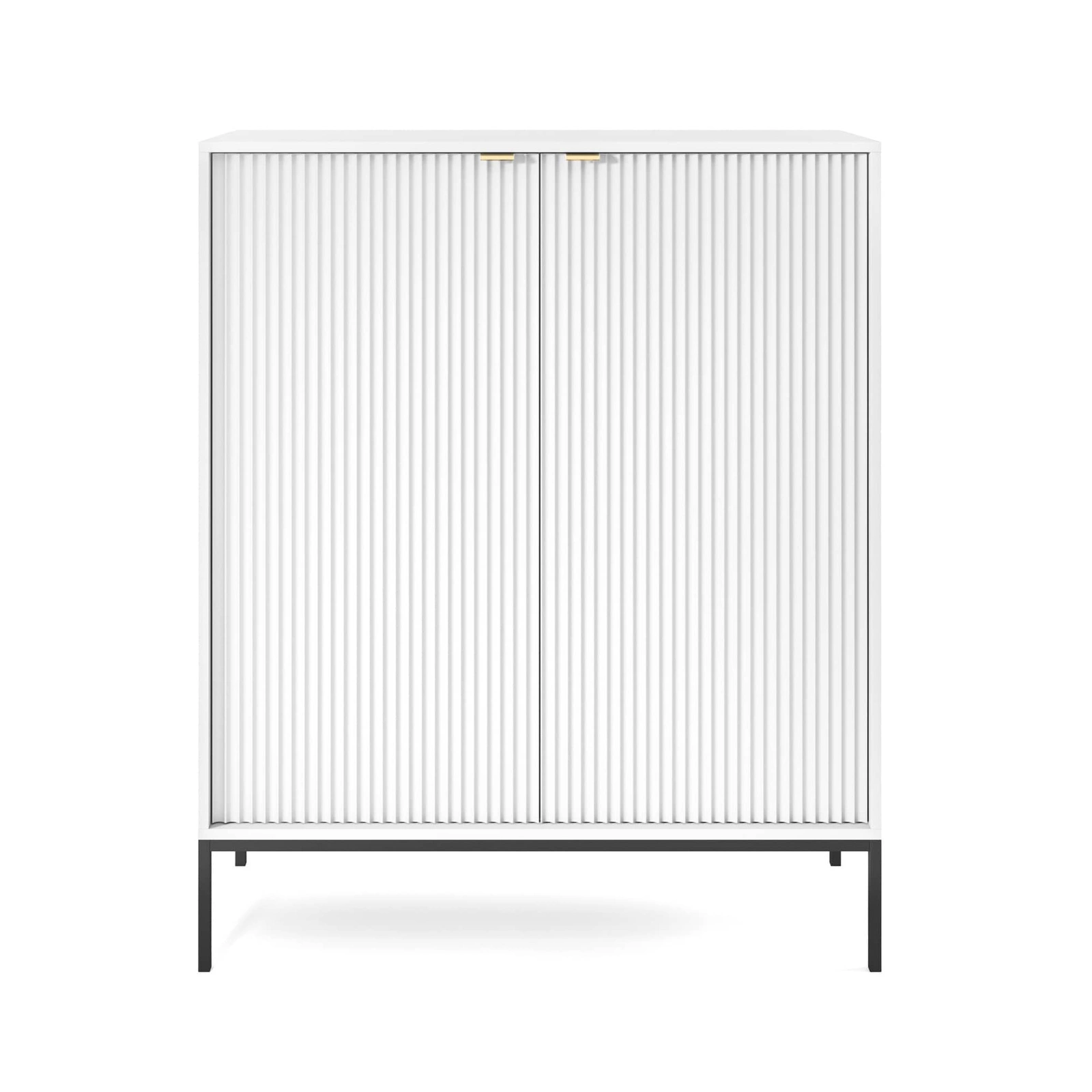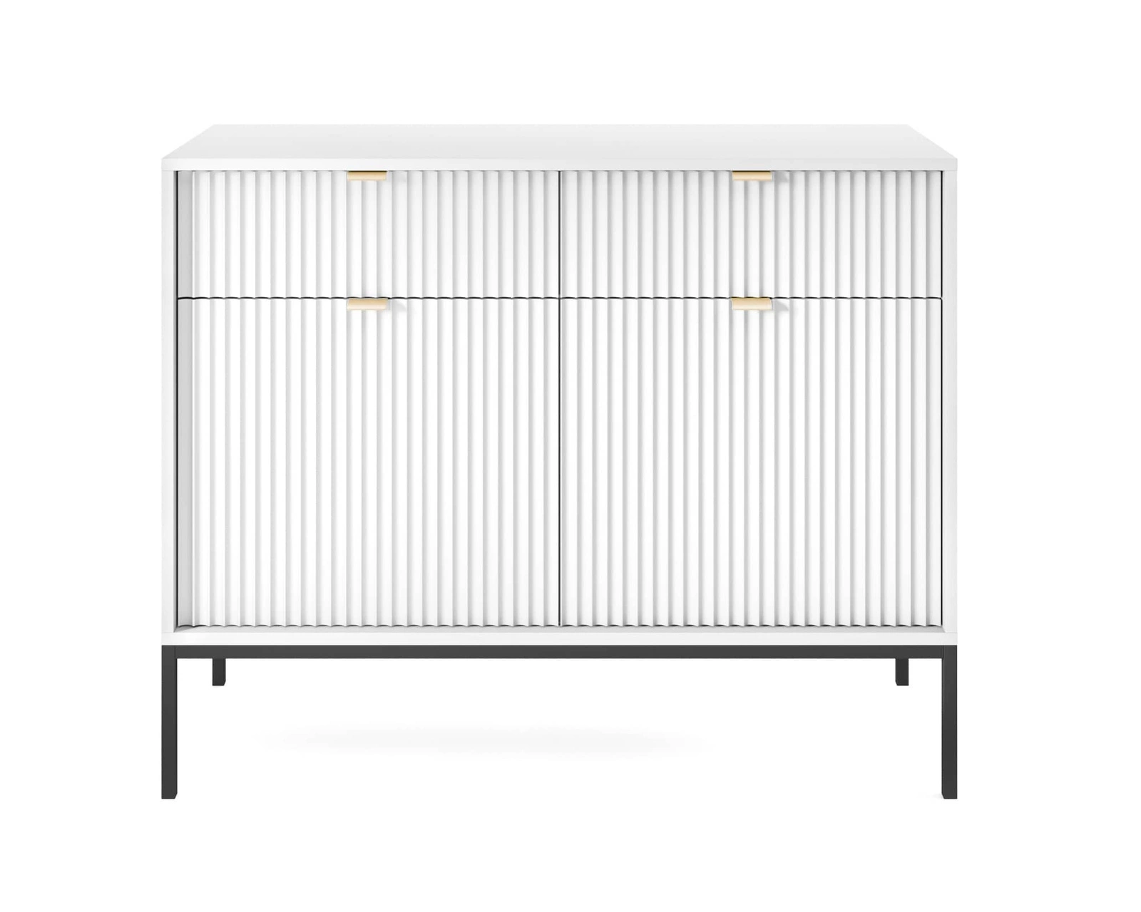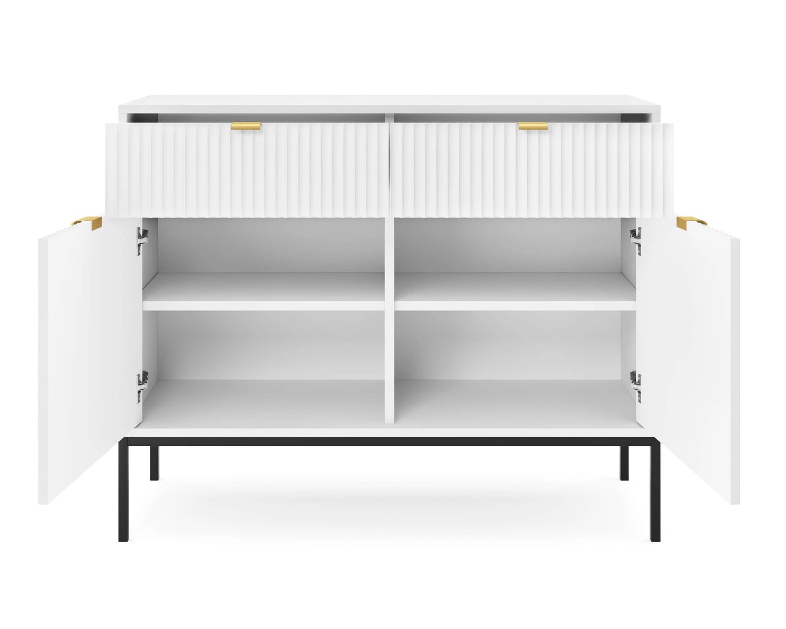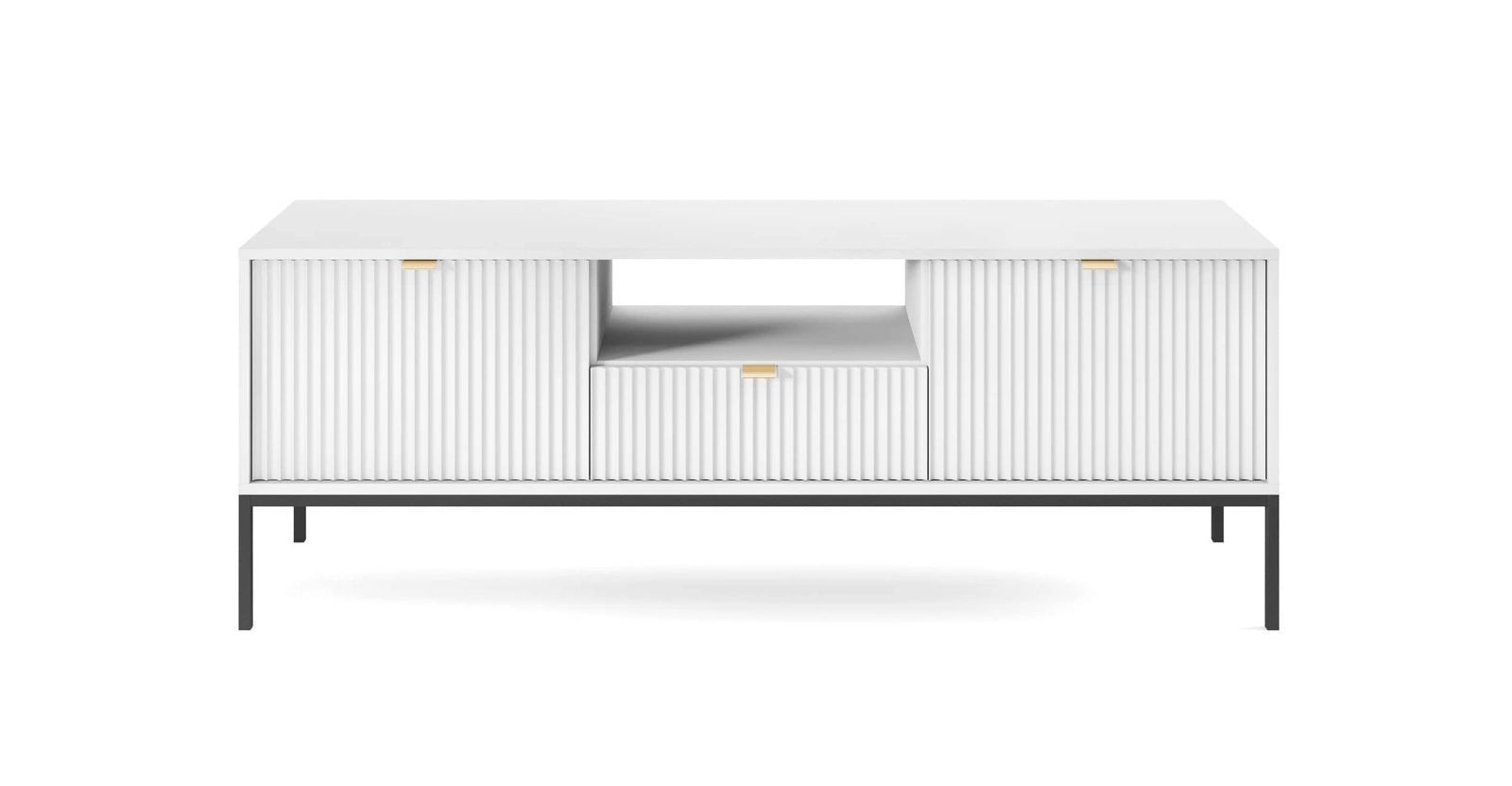 Ryflowane fronty wykonane z płyty MDF o grubości 18mm dodają szczególnego uroku. Stylowym wykończeniem frontów meblościanki są uchwyty krawędziowe w kolorze złotym. Konstrukcję mebli urozmaicono czarnymi metalowymi nogami o wysokości 20 cm.
