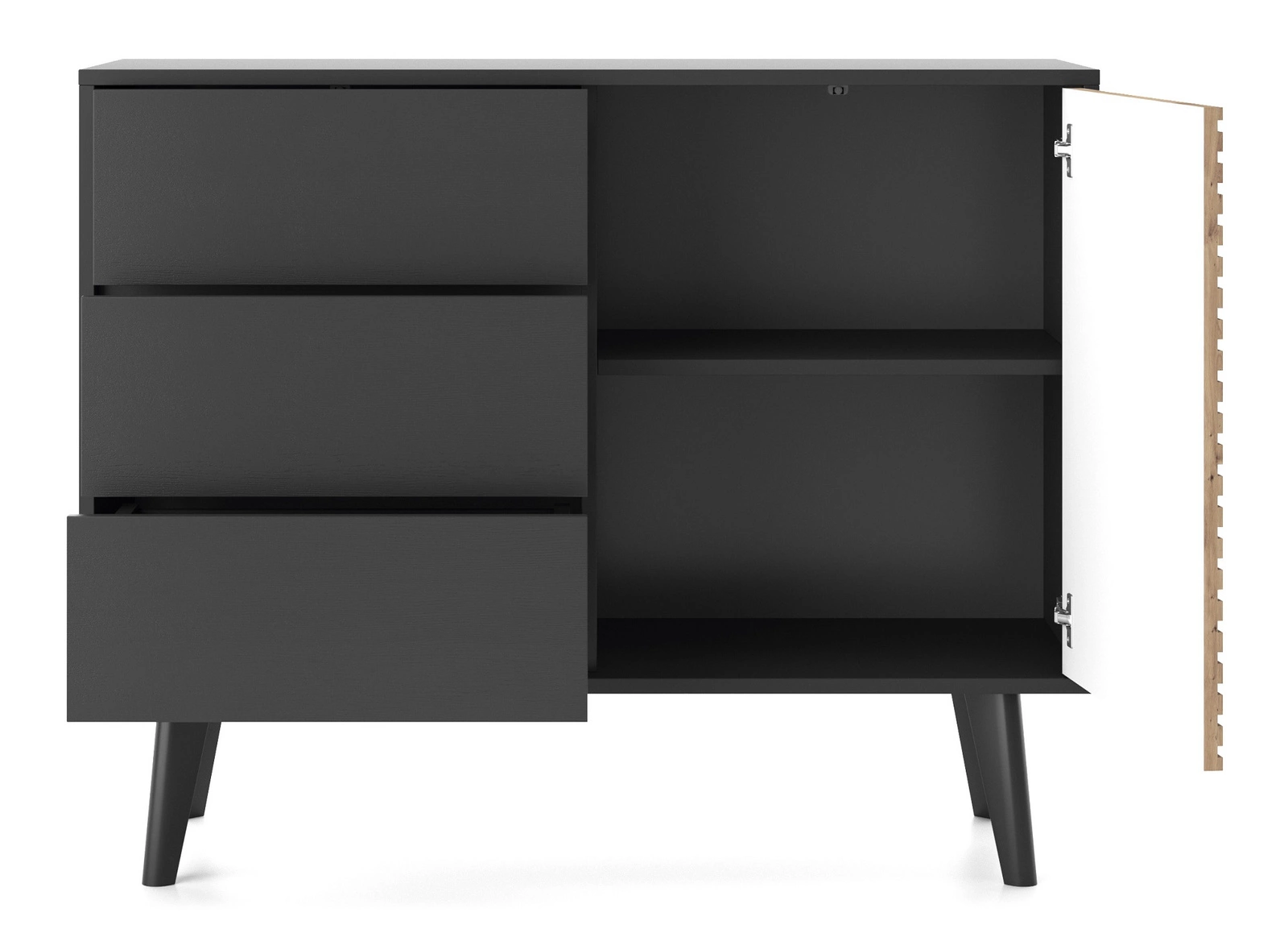 Zestaw mebli do salonu Saipan jest idealnym wyborem dla miłośników nowoczesnych aranżacji o eleganckim charakterze, dla których ważna jest również szeroka funkcjonalność mebla. Ciekawe zestawienie ryflowanych frontów w dębowym odcieniu z kontrastującą czernią nadają meblom oryginalnego i estetycznego wyglądu.