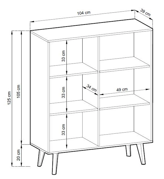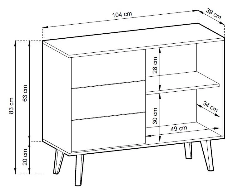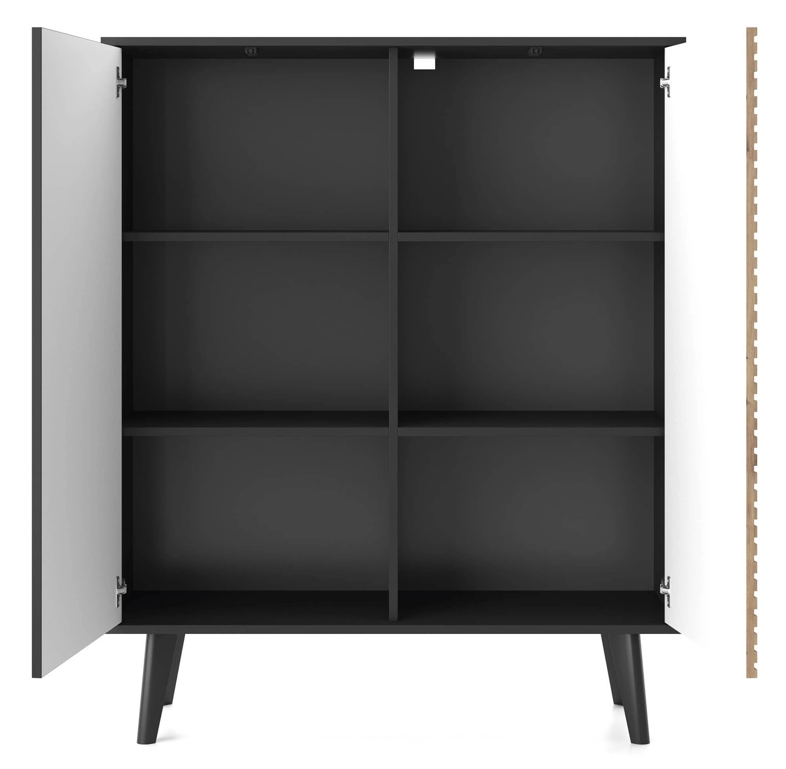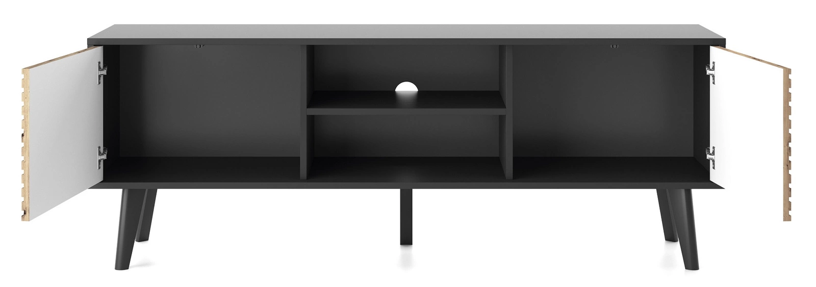 Ryflowane fronty zostały wykonane z płyty MDF o grubości 18mm. Korpusy wykonane z wysokiej jakości płyty laminowanej, która charakteryzuje się odpornością na wpływ czynników zewnętrznych takich jak obicia, uderzenia i niefortunne zadrapania. Konstrukcja mebli została wzmocniona gustownymi drewnianymi nogami w kolorze czarnym o wysokości 20 cm.