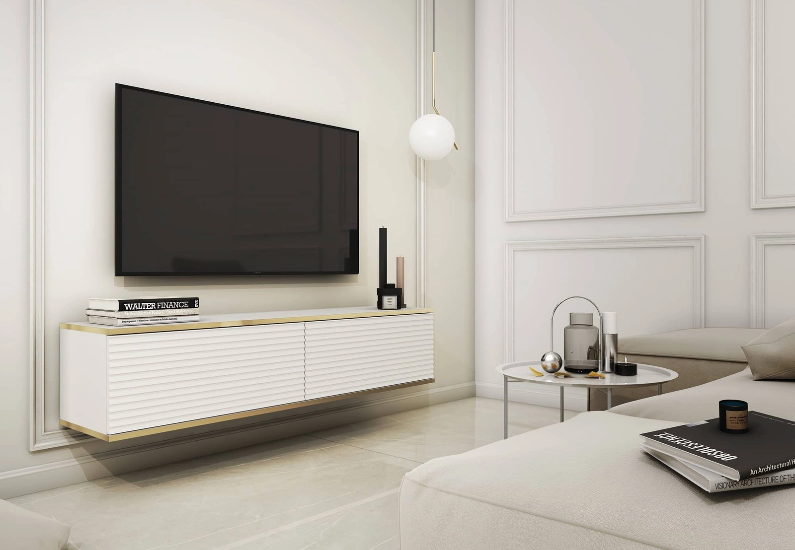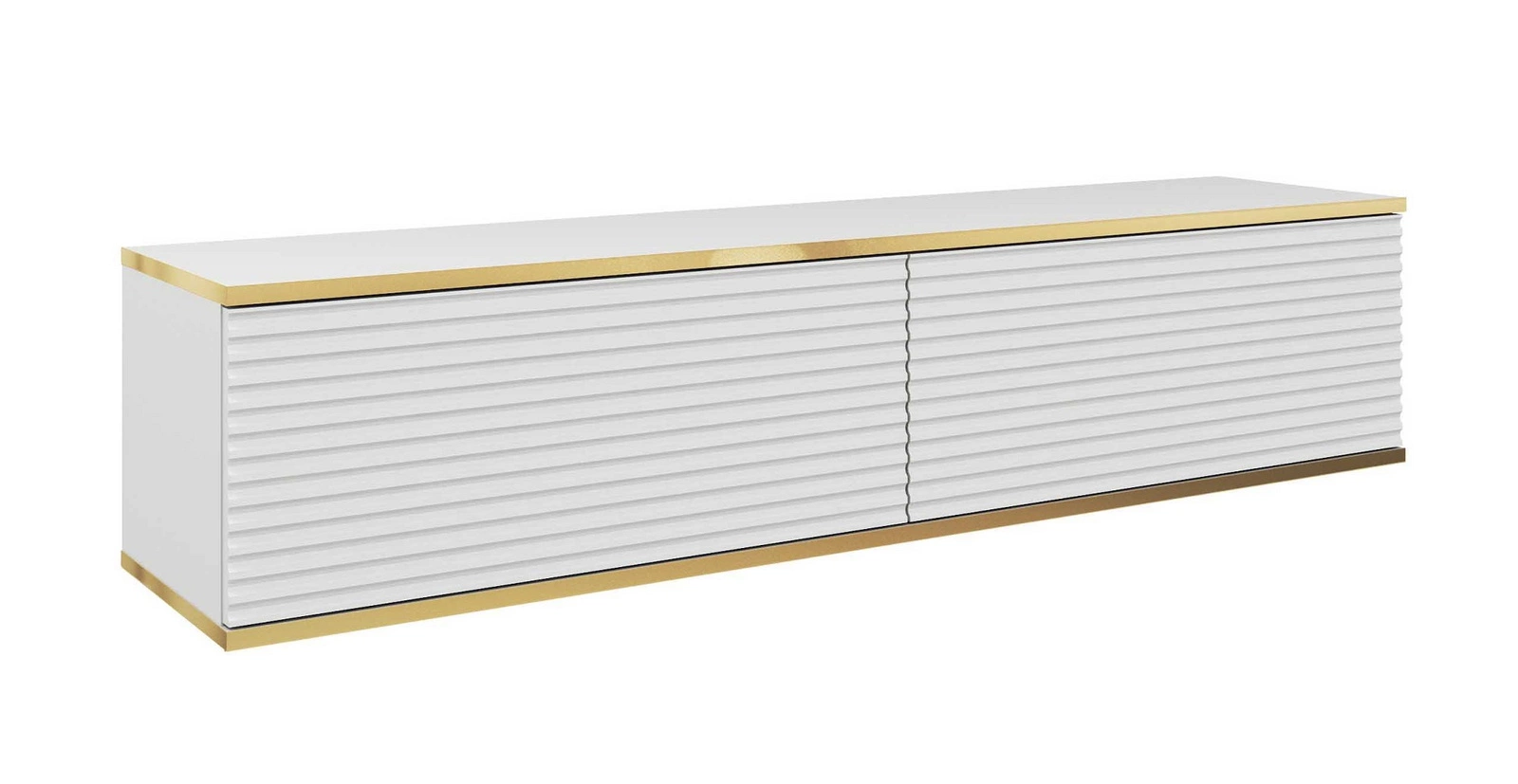 Szafka RTV wisząca Luxury 135 cm biała stylowy ryflowany front korpus zwieńczony złotą listwą zachwyci miłośników eleganckich aranżacji