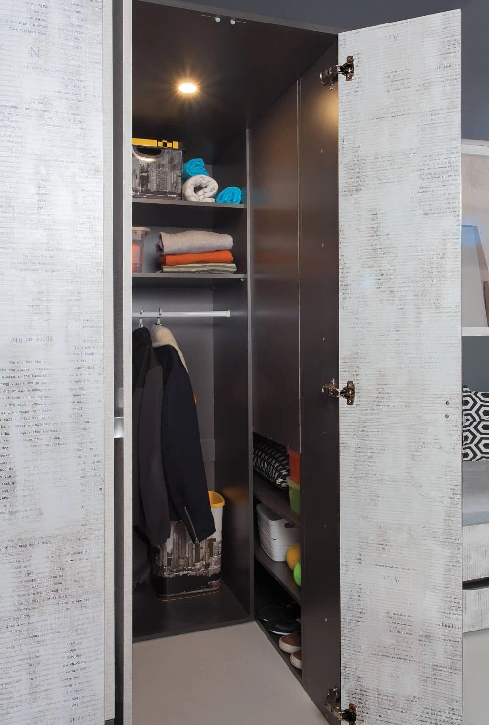 Szafa narożna z regałami Tablo w kolorze grafit / enigma to przepis na nowoczesne oraz funkcjonalne wnętrze w pokoju młodzieżowego.