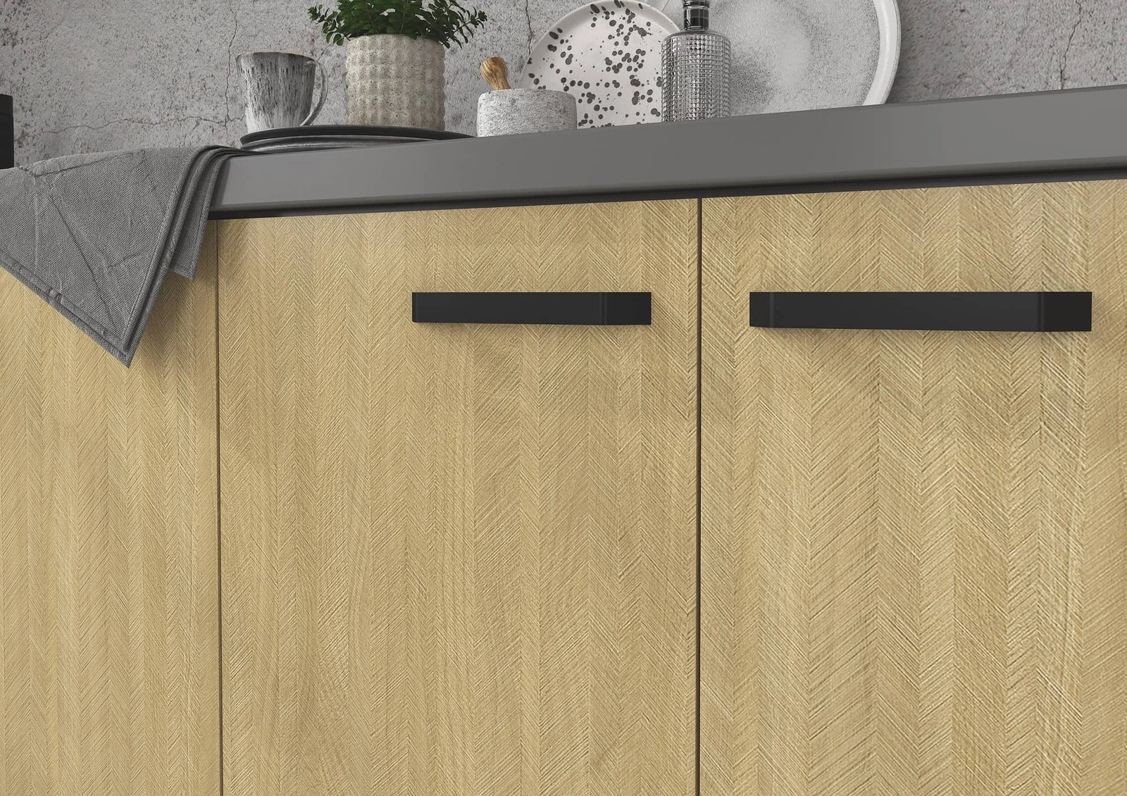 Fronty szafki kuchennej w kolorze beżowym zostały wykonane z płyty laminowanej oraz wykończone stylowym wzorem jodełki. Fronty wykazują wysoką wytrzymałość na działanie wilgoci oraz przypadkowe uszkodzenia. Stylowym wykończeniem frontów szafki kuchennej są metalowe uchwyty w kolorze czarnym.