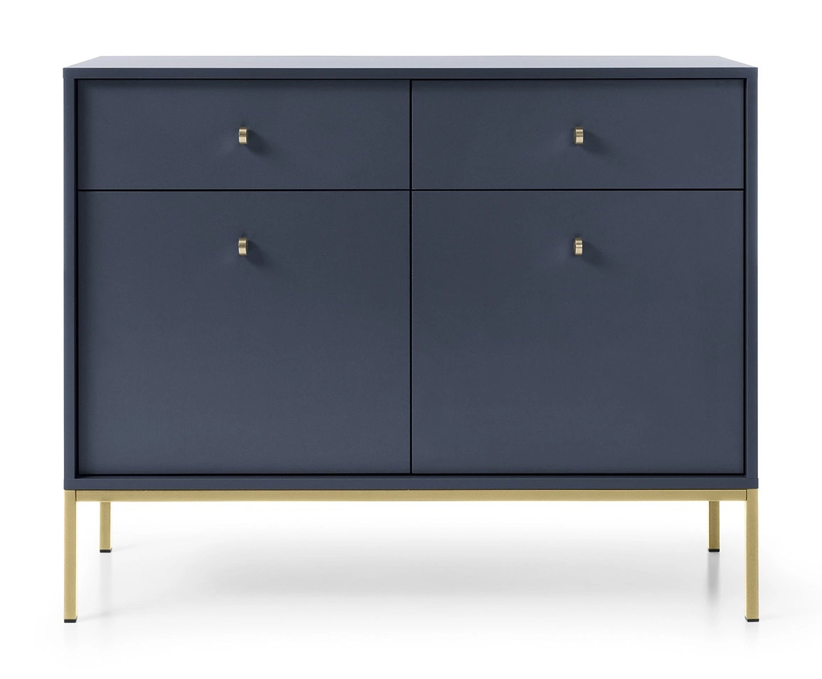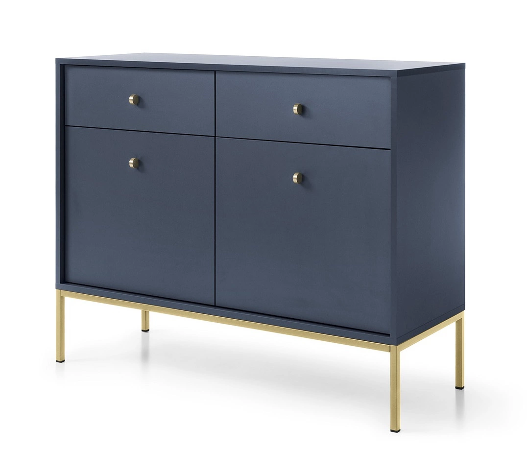 Komoda jest skonstruowana z 2 drzwi i 2 szuflad. Komoda gwarantuje komfortowe i bezproblemowe korzystanie oraz trwałość całego mebla przez wiele lat użytkowania. Zdecydowany i głęboki granatowy świetnie łączy się z innymi kolorami, dzięki czemu komoda z szufladami Mono świetnie sprawdzi się jako komoda do salonu lub komoda do sypialni.