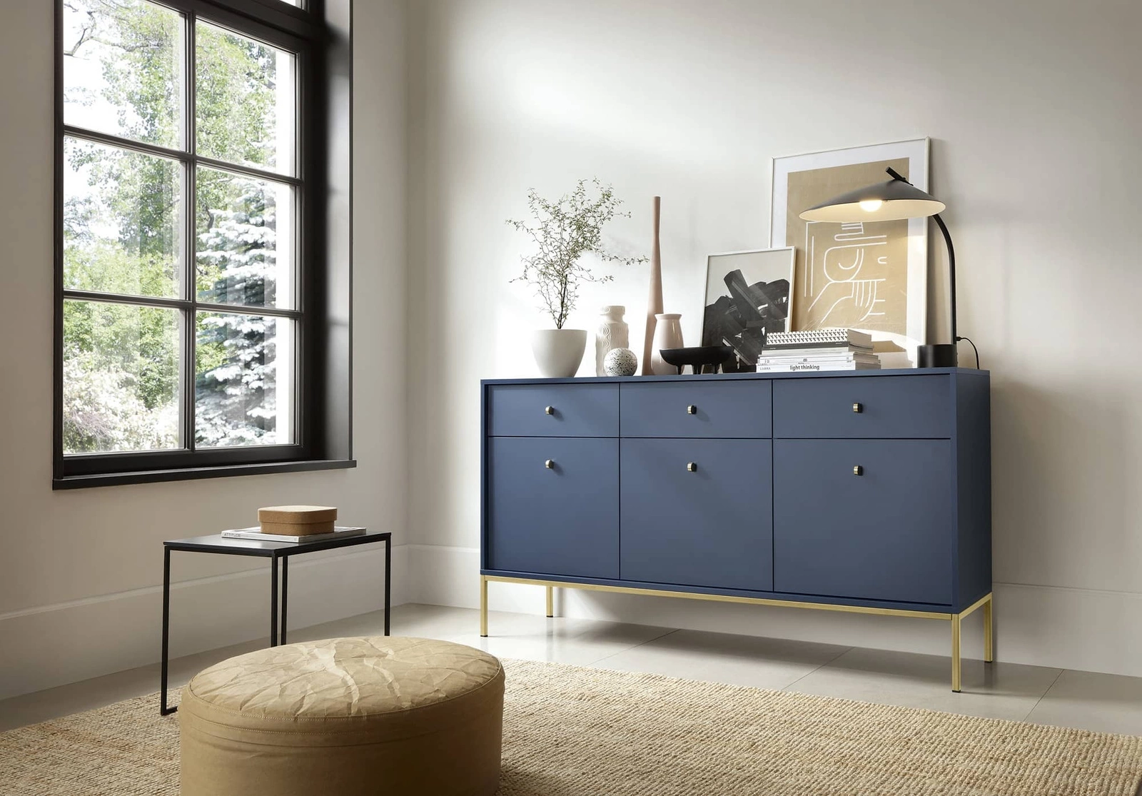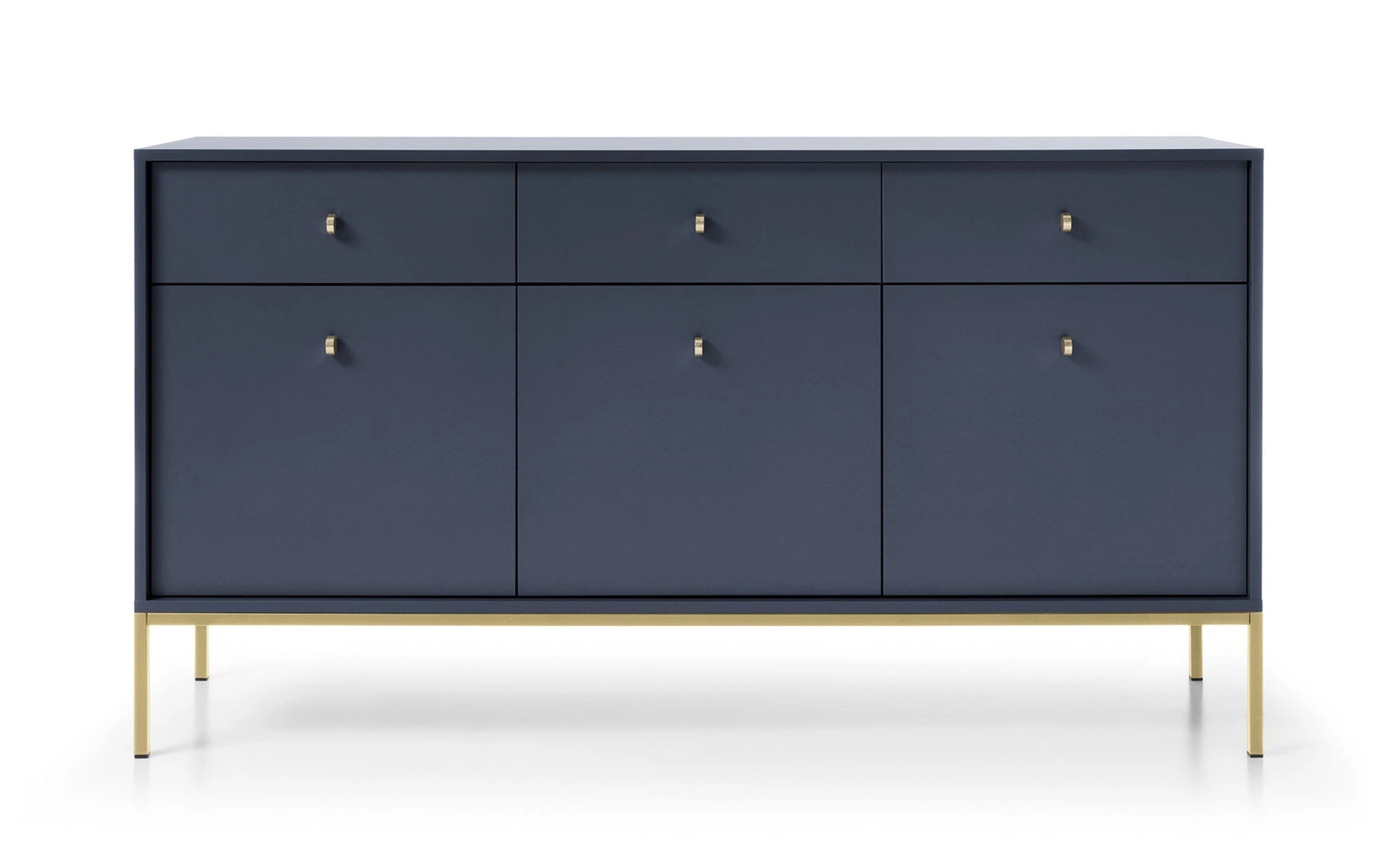 Komoda jest skonstruowana z 3 drzwi i 3 szuflad. Komoda gwarantuje komfortowe i bezproblemowe korzystanie oraz trwałość całego mebla przez wiele lat użytkowania. Zdecydowany i głęboki granatowy świetnie łączy się z innymi kolorami, dzięki czemu komoda z szufladami Mono świetnie sprawdzi się jako komoda do salonu lub komoda do sypialni.