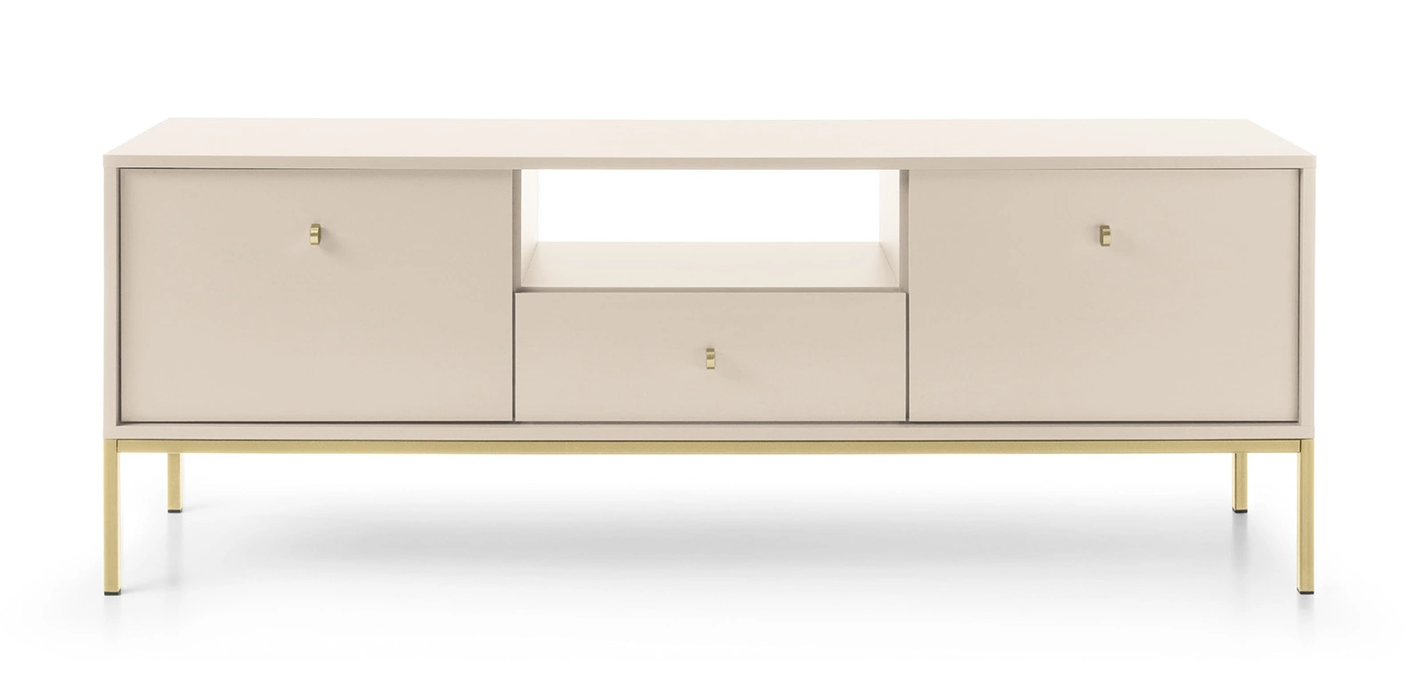 Szafka RTV Mono 154 cm beżowa minimalistyczny design prosta forma wzbogacona o metalowe złote elementy stylowy uchwyt