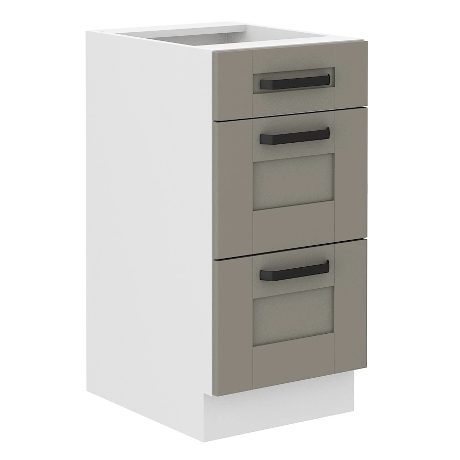 Szafka kuchenna z szufladami Ponza w kolorze szary beż / biały należy do kategorii mebli kuchennych modułowych, z których można utworzyć dowolne zestawy.