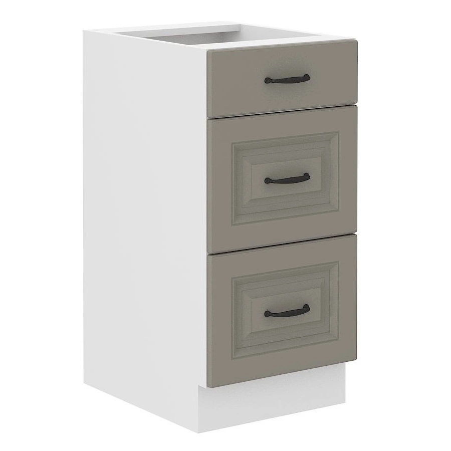 Szafka kuchenna z szufladami Kastos w kolorze szary beż / biały należy do kategorii mebli kuchennych modułowych, z których można utworzyć dowolne zestawy.
