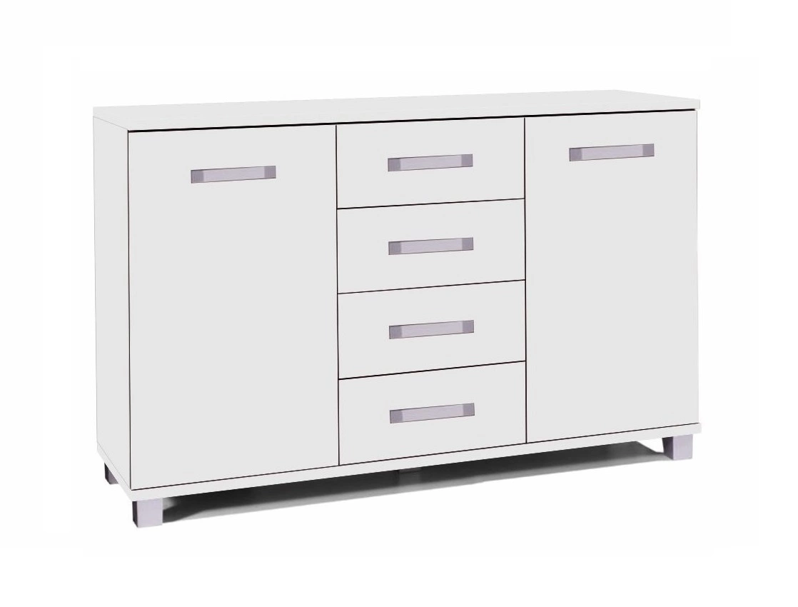 Komoda z kolekcji Maximus charakteryzuje się prostymi kształtami oraz stylowymi nogami w kolorze aluminium. Mebel skonstruowany jest z 2 drzwi i 4 szuflad wysuwanych na prowadnicach rolkowych.