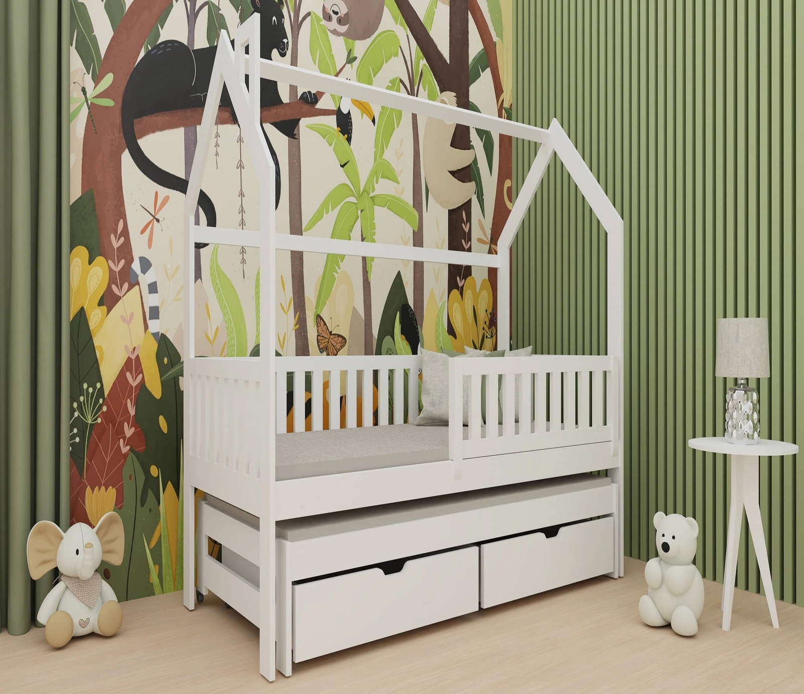 Łóżko dziecięce domek Miki 70x160 cm w kolorze białym idealnie wpasuje się do każdego pokoju dziecięcego.