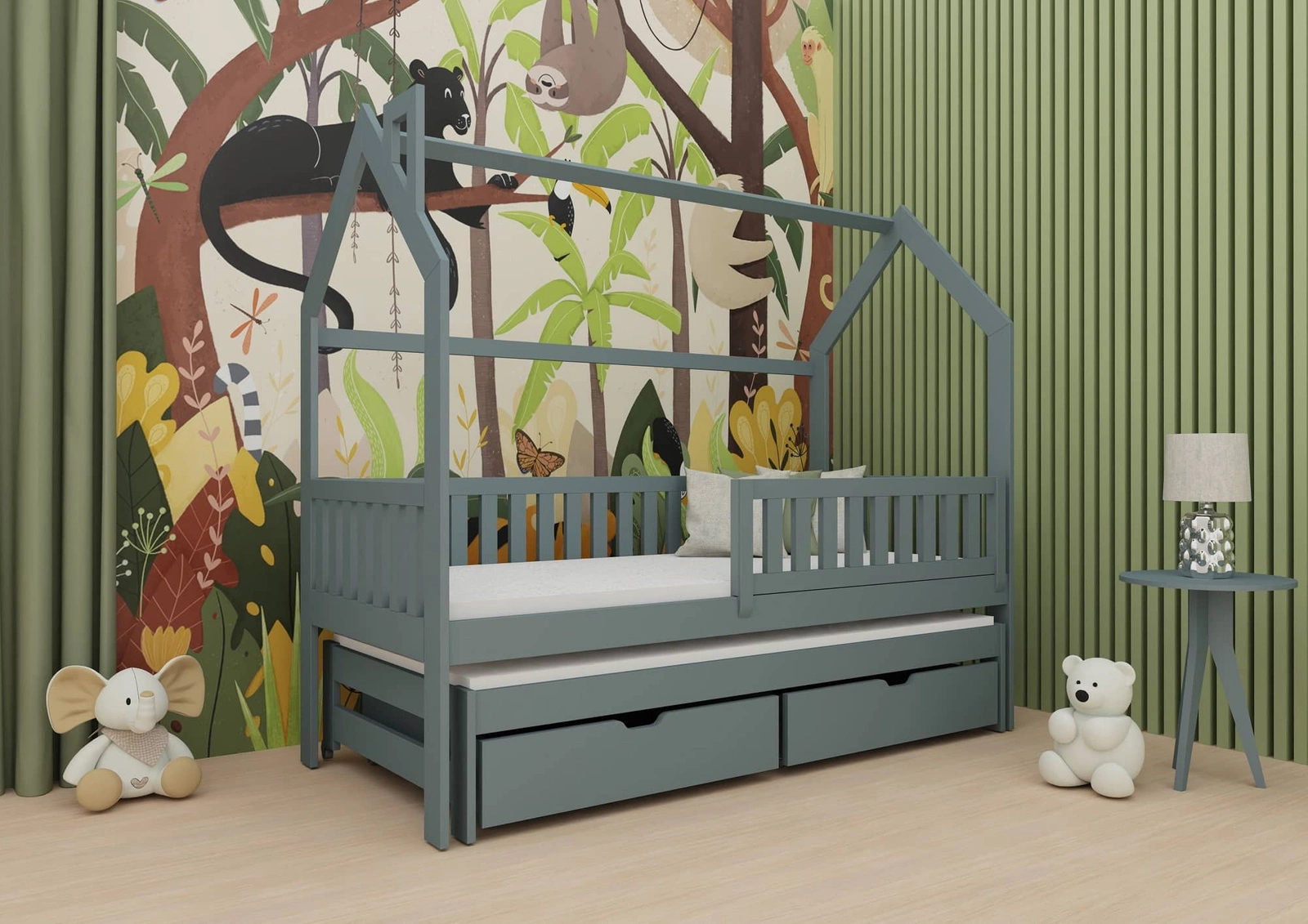 Łóżko dziecięce Miki 80x170 cm szare łóżko 2 osobowe wysuwane do pokoju dziecka łóżko domek wykonane z litego drewna sosnowego