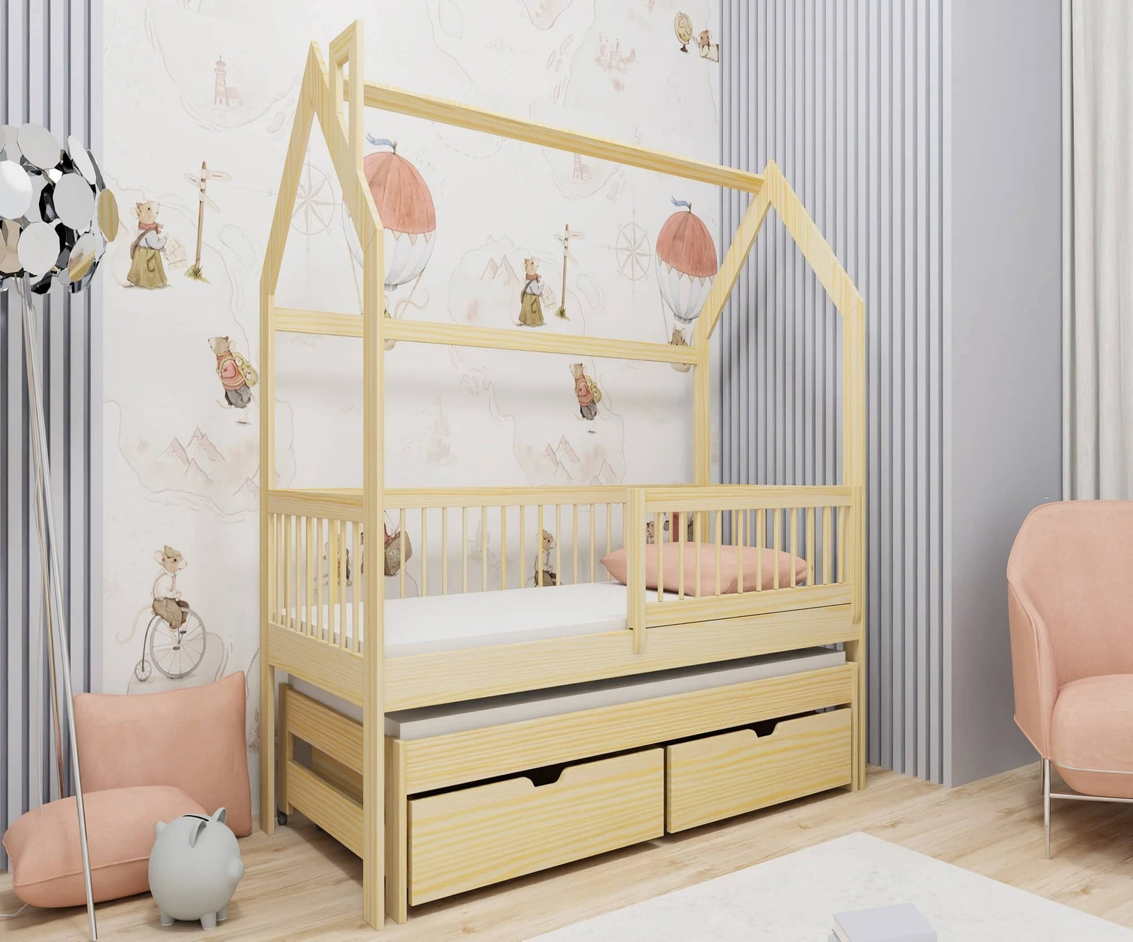 Łóżko dziecięce Dyzio 70x140 cm sosnowe łóżko 2 osobowe wysuwane do pokoju dziecka drewniane łóżko domek z pojemnymi szufladami