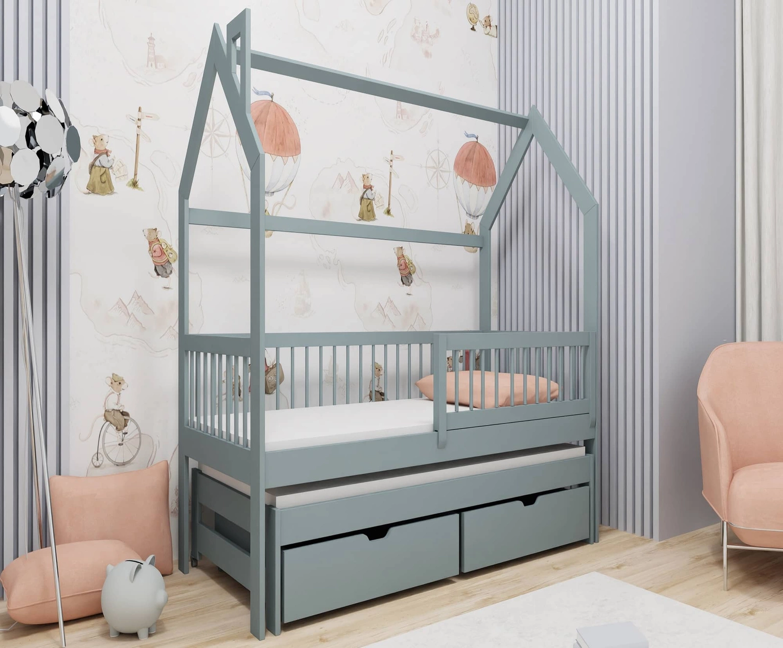 Łóżka piętrowe domek to doskonała opcja do pokoju dziecięcego. Solidna konstrukcja łóżka zapewnia komfort oraz bezpieczeństwo podczas snu oraz zabawy. Łóżka dla dzieci Dyzio wykonane są z litego drewna sosnowego pomalowanego na szaro, które charakteryzuje dużą wytrzymałością i jest odporne na czynniki zewnętrzneWysuwane łóżko jest wyposażone w dwa kółeczka, które ułatwiają wyciąganie. Sprawdzony system łączenia za pomocą kołków drewnianych i śrub konfirmatowych zapewniają dużą stabilność całej konstrukcji.