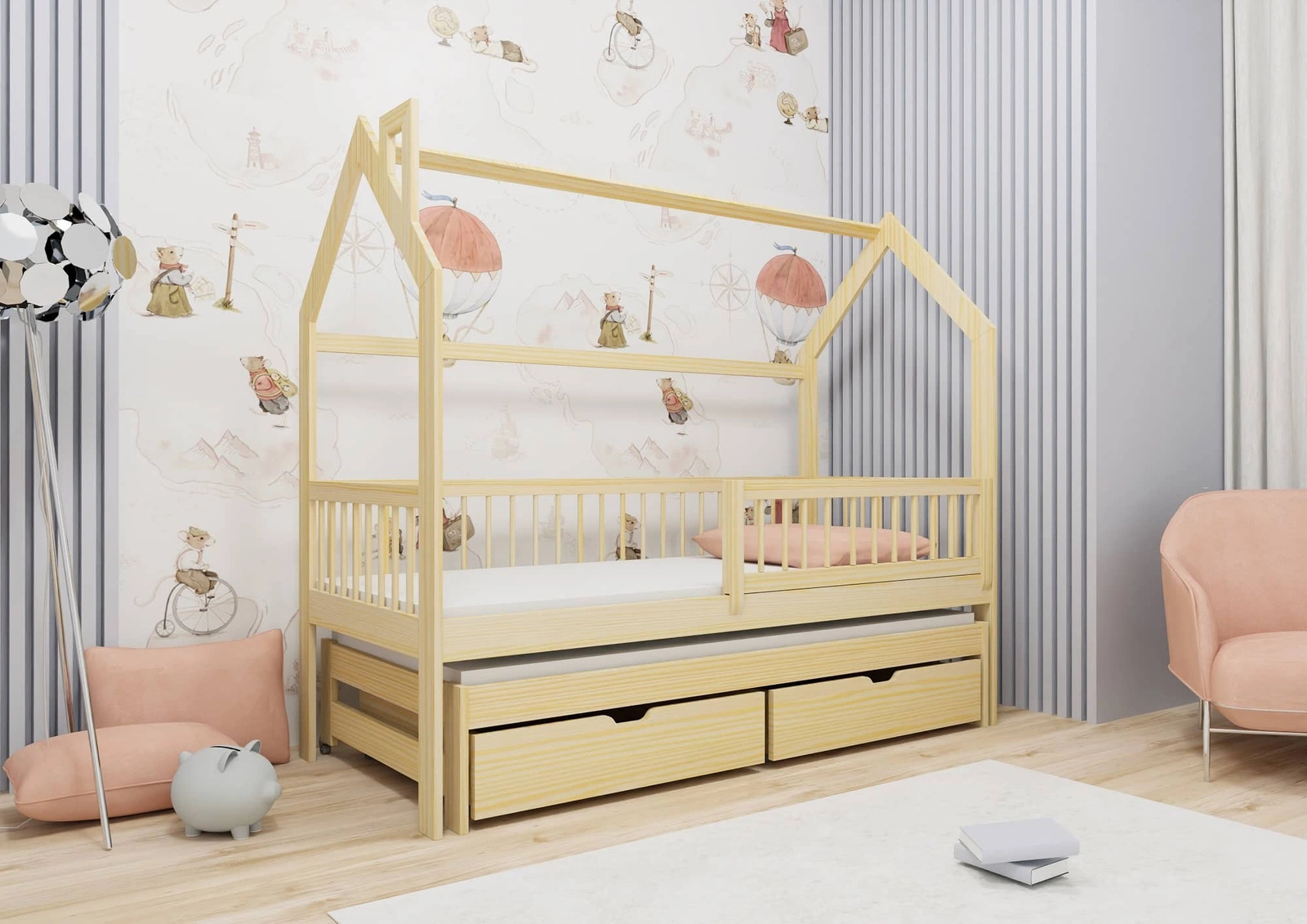 Łóżko dziecięce Dyzio 90x200 cm sosnowe łóżko 2 osobowe wysuwane do pokoju dziecka drewniane łóżko domek z pojemnymi szufladami