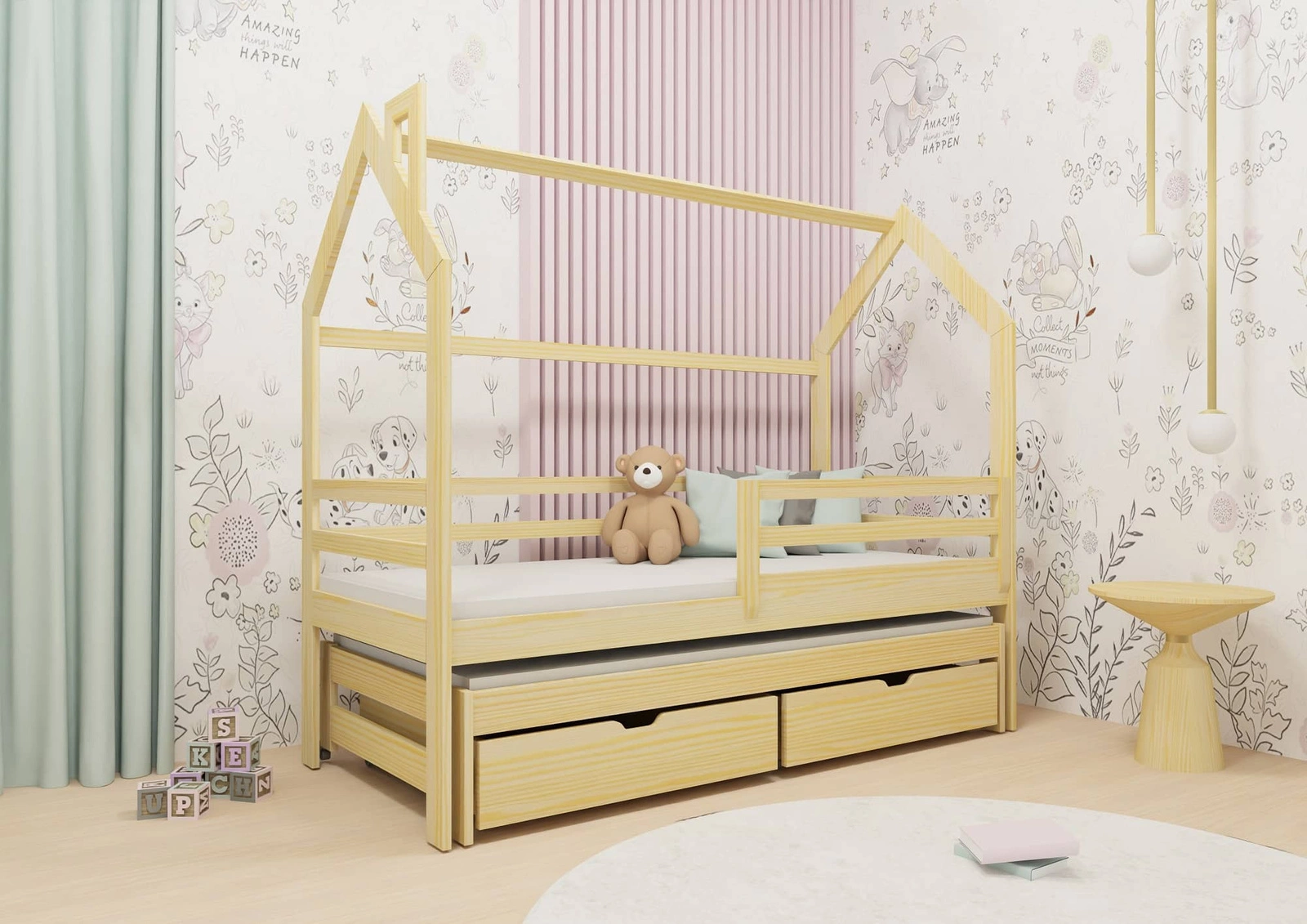 Łóżko dziecięce Chip 90x180 cm sosnowe drewniane łóżko domek z pojemnymi szufladami łóżko 2 osobowe wysuwane do pokoju dziecka