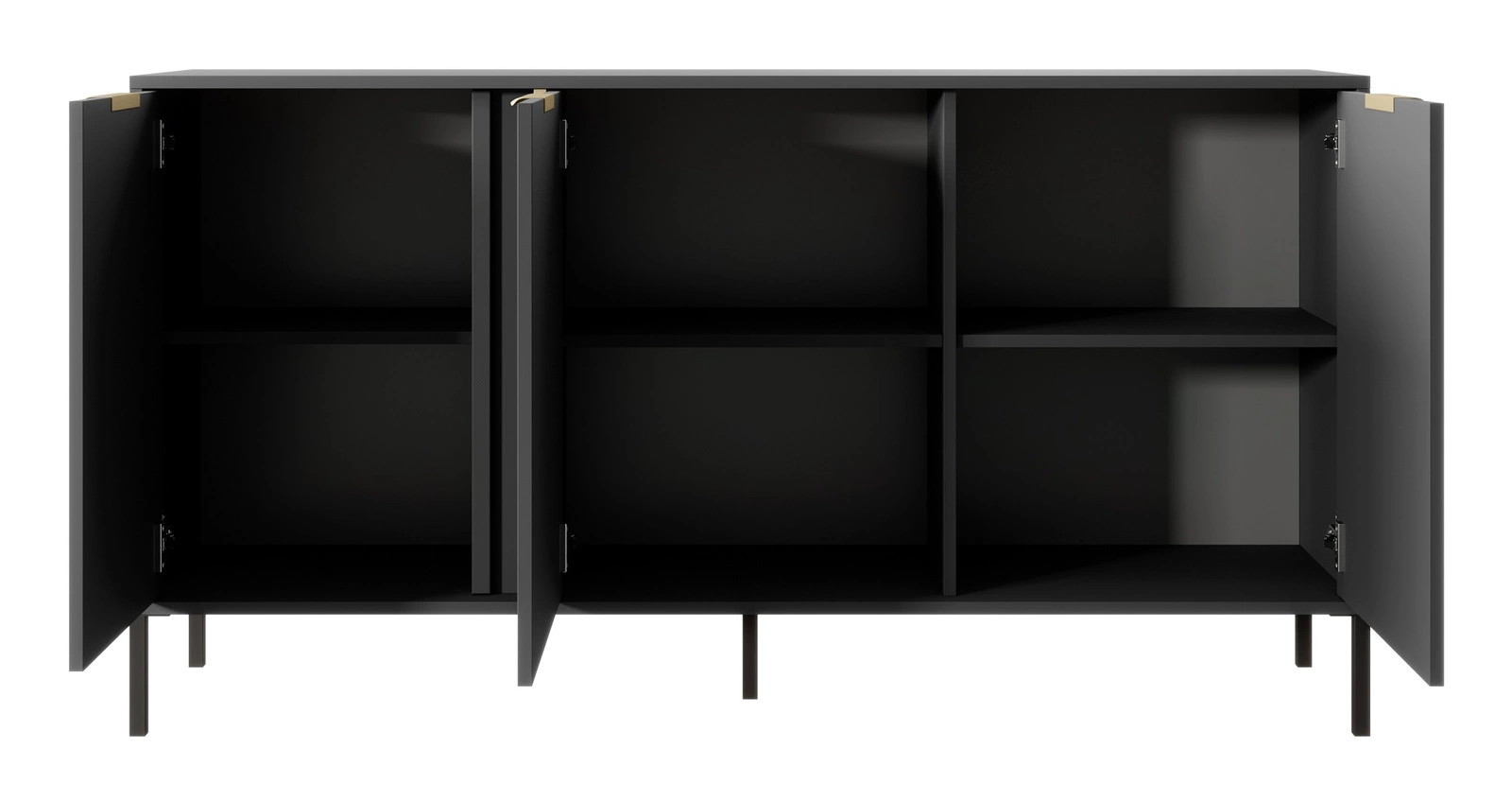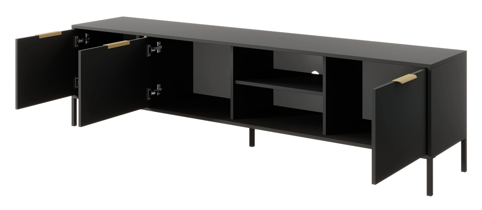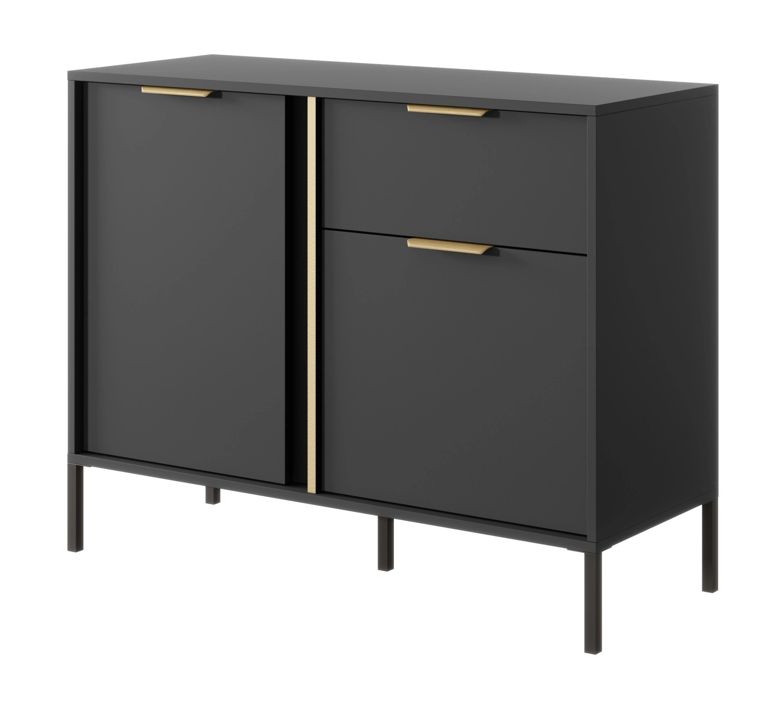 Meblościanka wykonana została z wysokiej jakości płyty laminowanej o grubości 16mm, która charakteryzuje się odpornością na wpływ czynników zewnętrznych takich jak obicia, uderzenia i niefortunne zadrapania. Stylowym wykończeniem frontów mebli są niewielkie uchwyty krawędziowe w kolorze złotym. Konstrukcję mebli urozmaicono czarnymi metalowymi nogamiktóre gwarantują stabilność całej bryły.