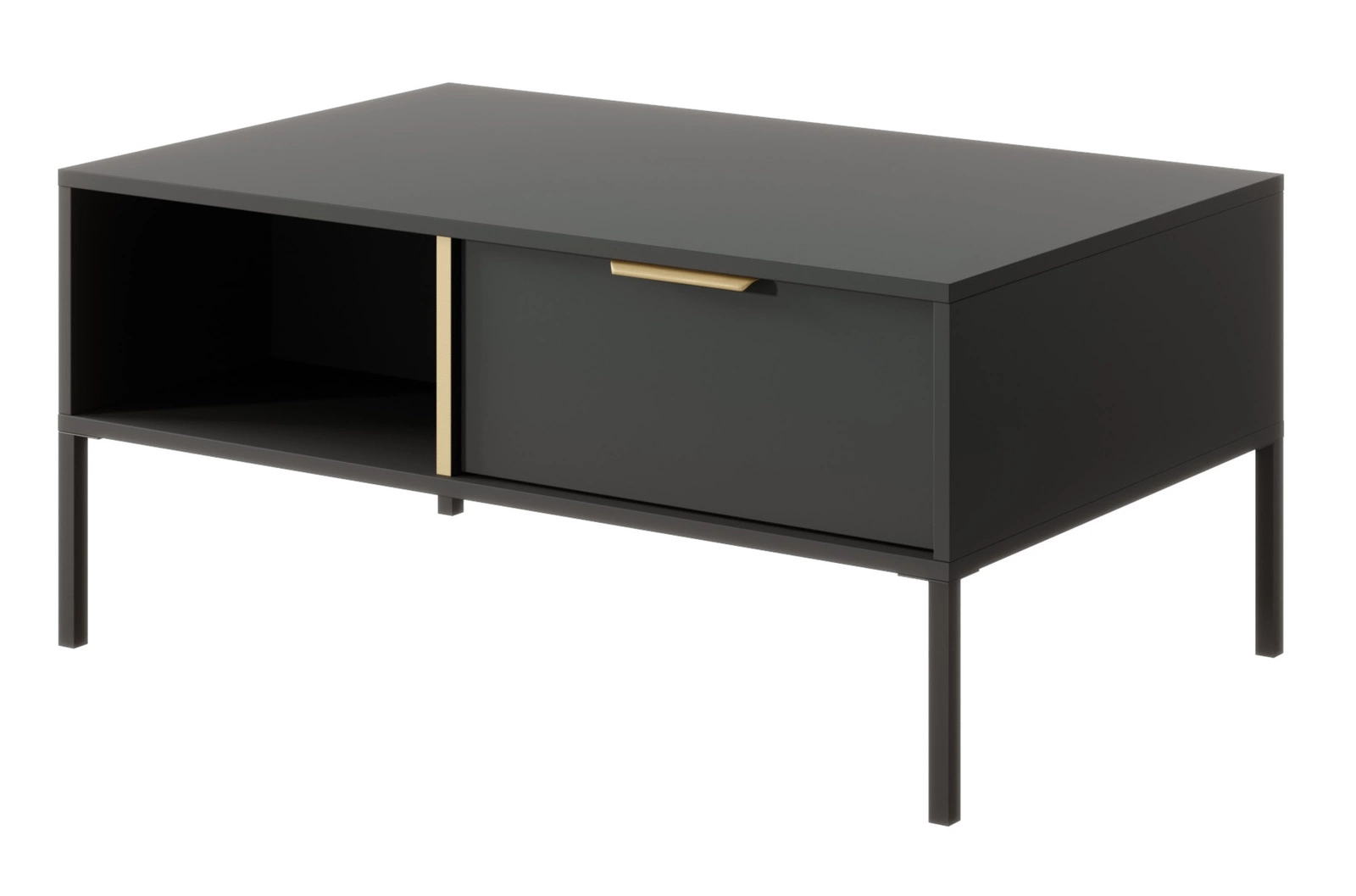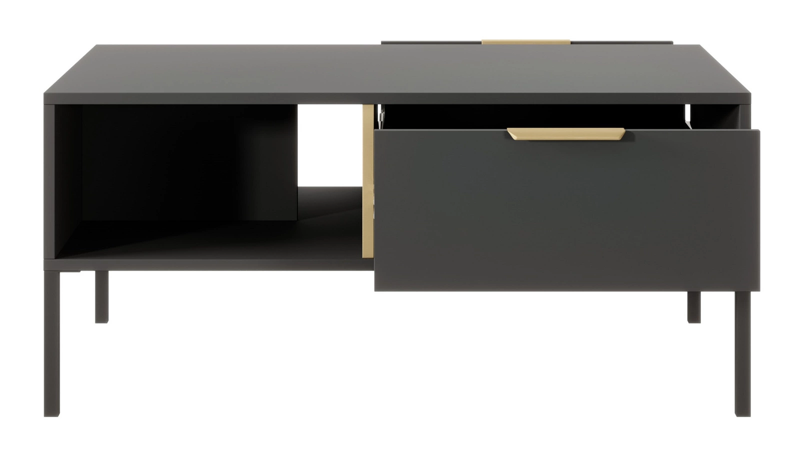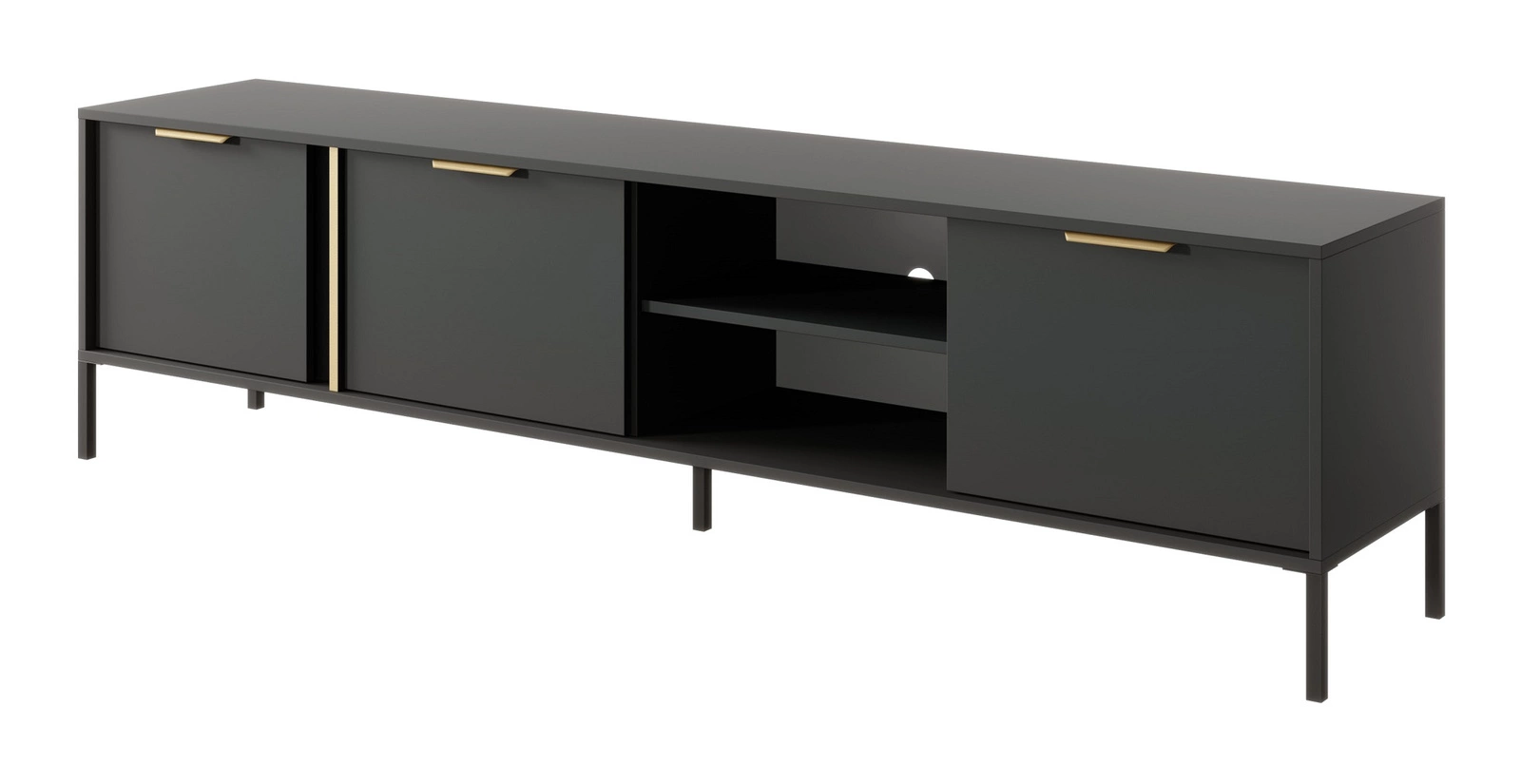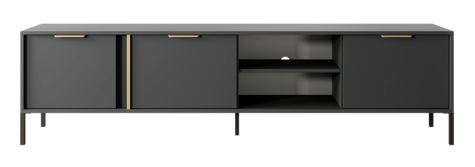 • Zestaw mebli Golden to stylowe meble, które idealnie wkomponują się do każdego salonu lub pokoju dziennego. Modne zestawienie klasycznego antracytu ze złotymi elementami nadaje meblom szyku i niepowtarzalnego stylu. Metalowe nogi gwarantują stabilność.