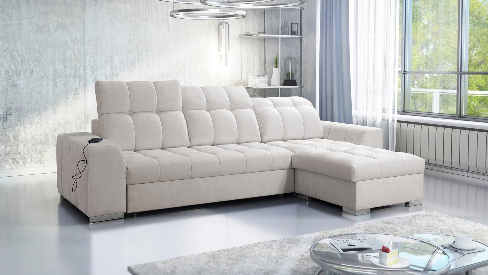 Dodatki tego mebla, które docenią wszyscy użytkownicy to dwa pojemniki na pościel, funkcja spania oraz gniazdo ładowania USB w boczku narożnika.