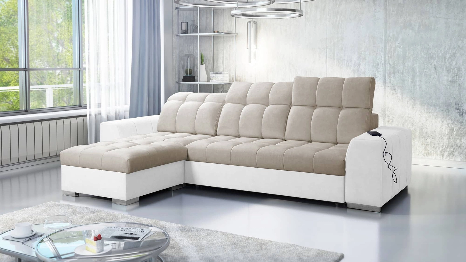 Dodatki tego mebla, które docenią wszyscy użytkownicy to dwa pojemniki na pościel, funkcja spania oraz gniazdo ładowania USB w boczku narożnika.