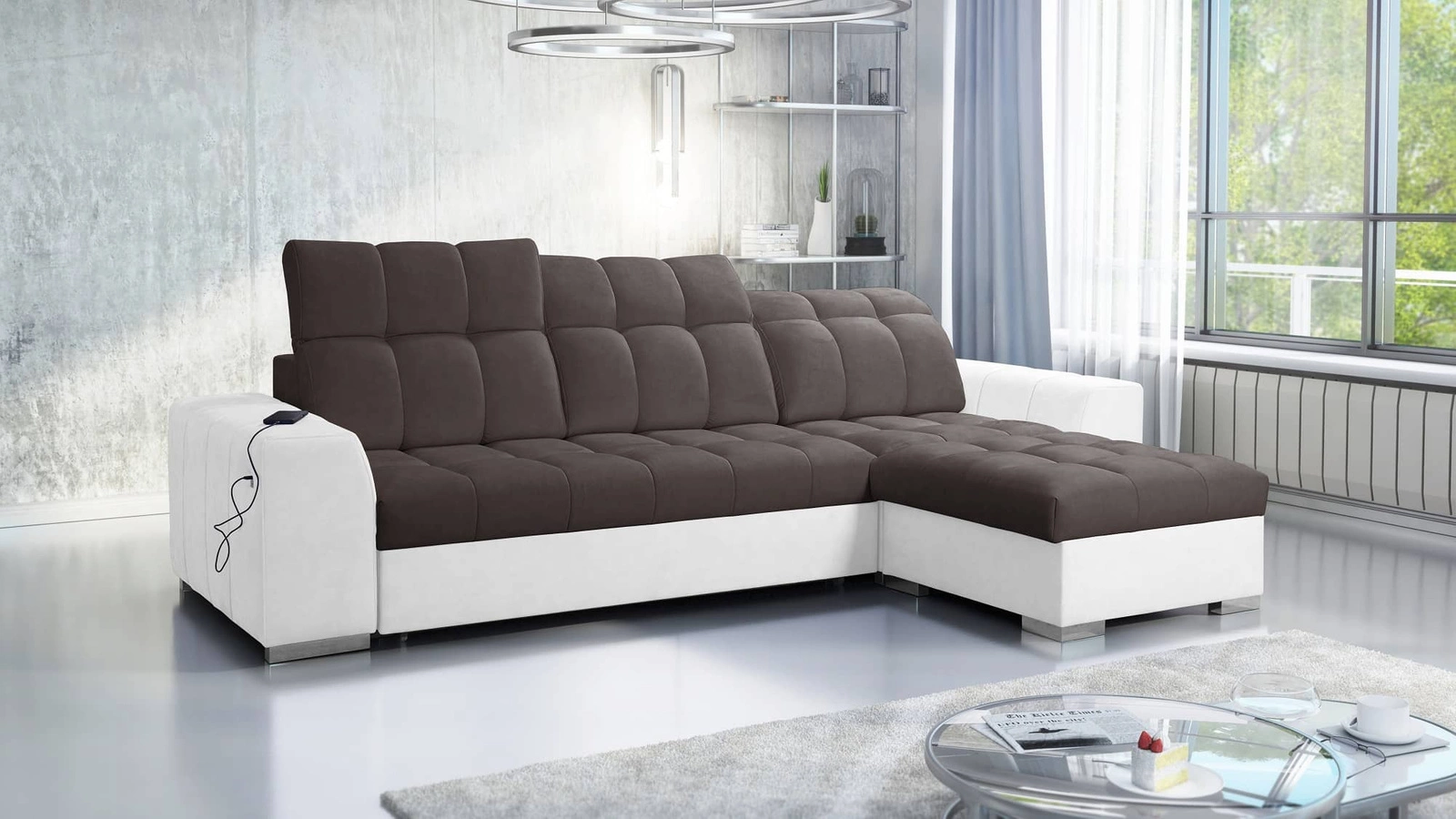 Narożnik Luigi w kolorze brązowym / biały z regulowanymi zagłówkami to zachwycający mebel z gwarancją najwyższego komfortu i funkcjonalności!