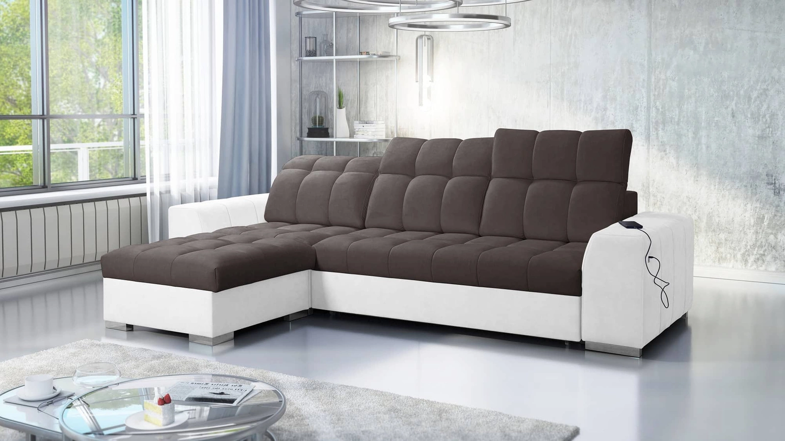 Narożnik Luigi w kolorze brązowym / biały z regulowanymi zagłówkami to zachwycający mebel z gwarancją najwyższego komfortu i funkcjonalności!