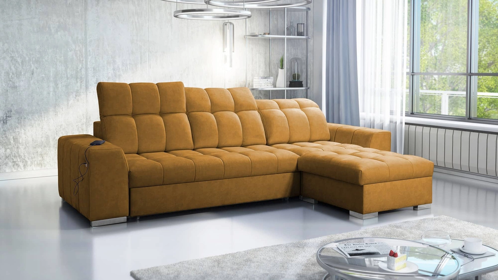 Narożnik Luigi w kolorze miodowym z regulowanymi zagłówkami to zachwycający mebel z gwarancją najwyższego komfortu i funkcjonalności!