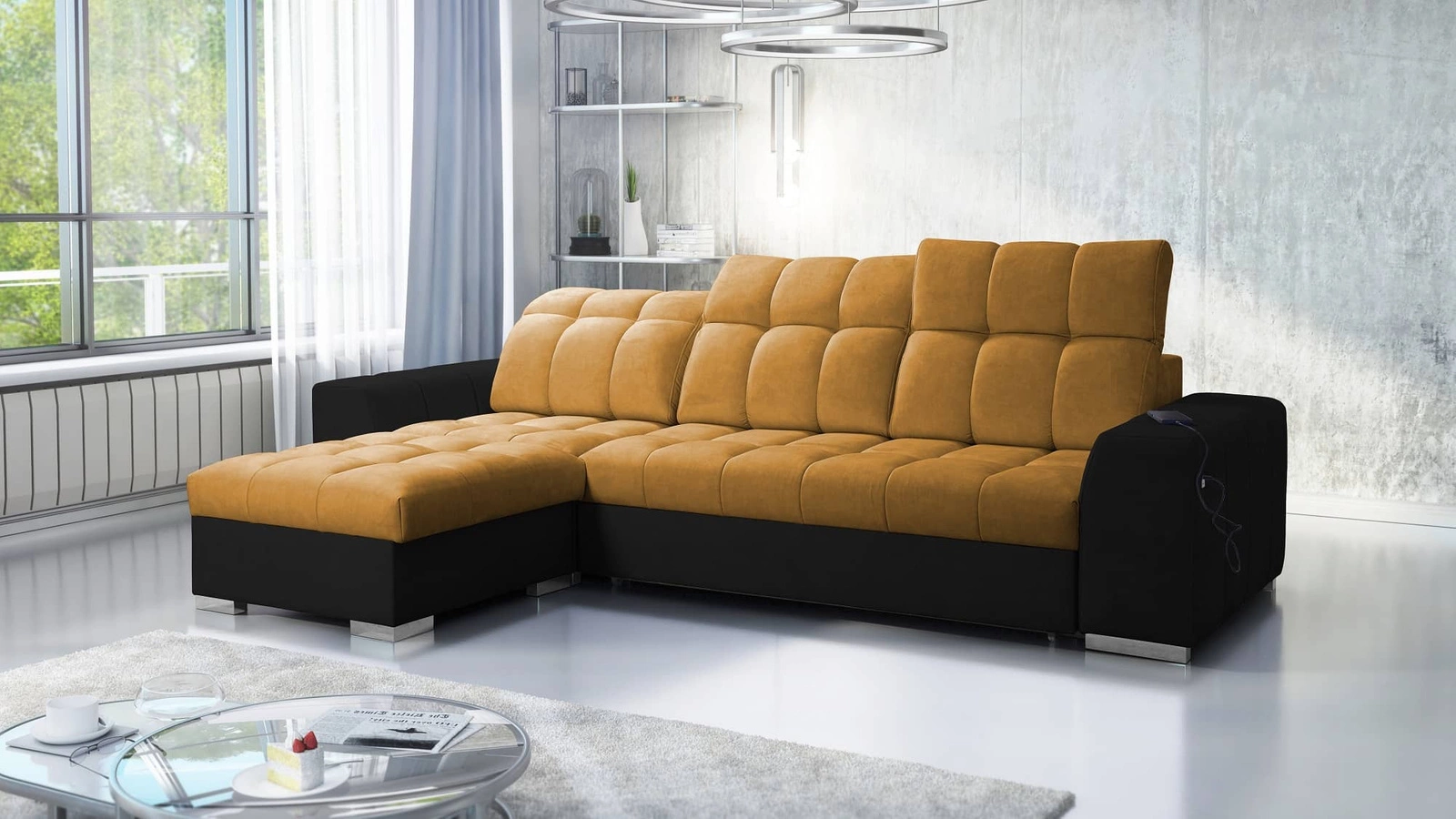 Narożnik Luigi w kolorze miodowym / czarny z regulowanymi zagłówkami to zachwycający mebel z gwarancją najwyższego komfortu i funkcjonalności!