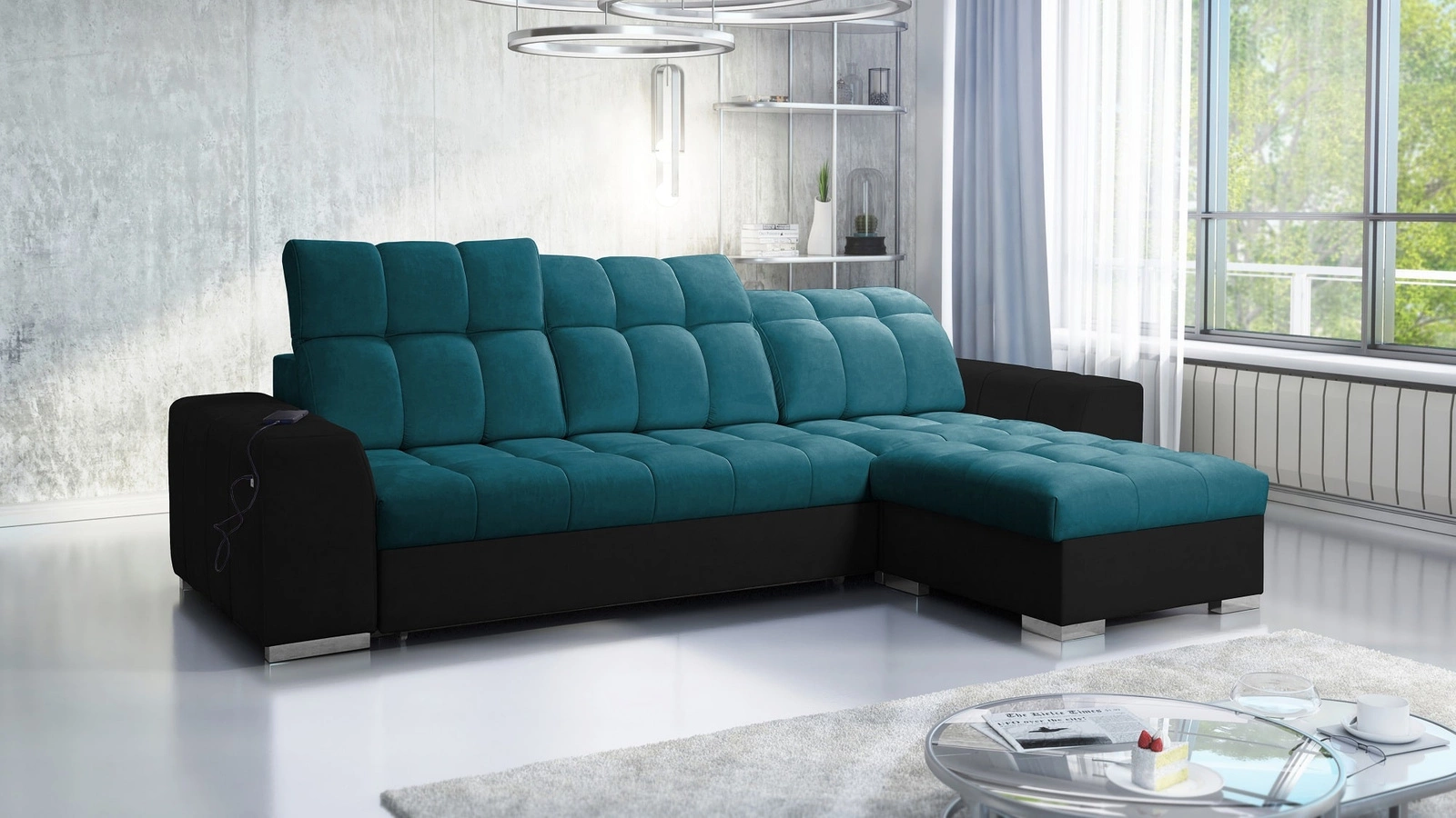 Narożnik Luigi w kolorze turkusowym / czarny z regulowanymi zagłówkami to zachwycający mebel z gwarancją najwyższego komfortu i funkcjonalności!