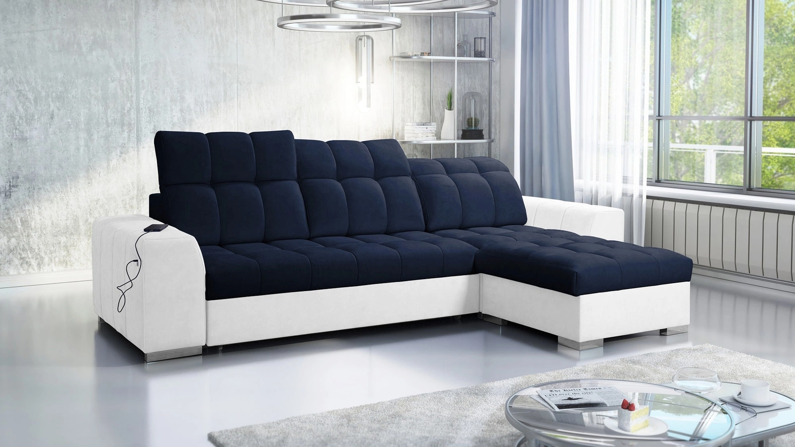 Narożnik Luigi w kolorze granatowym / biały z regulowanymi zagłówkami to zachwycający mebel z gwarancją najwyższego komfortu i funkcjonalności!