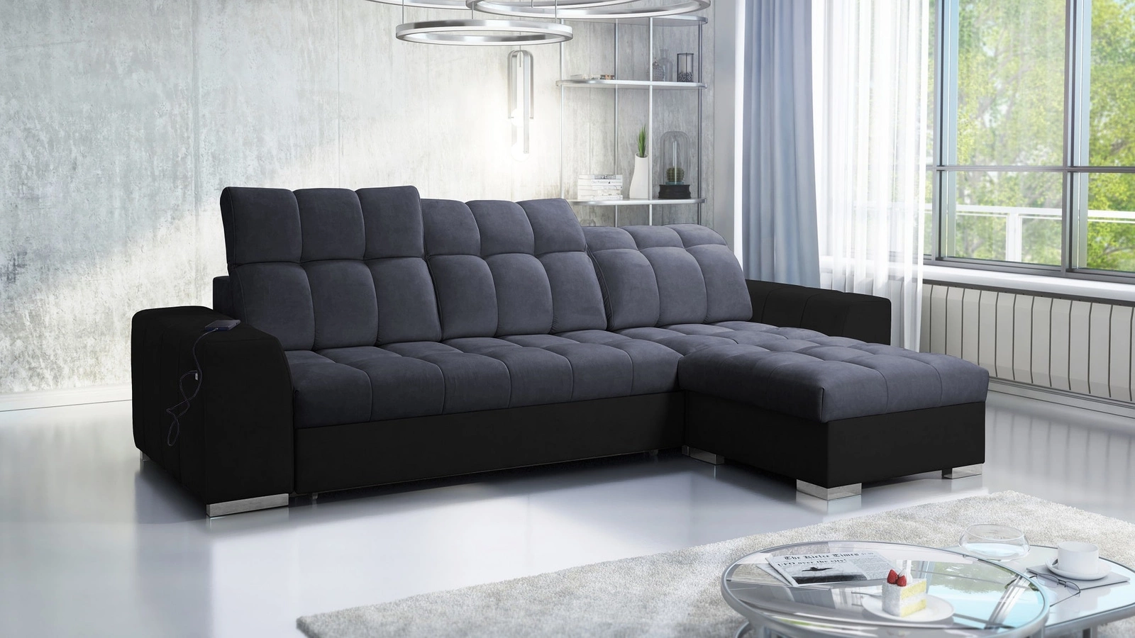 Dodatki tego mebla, które docenią wszyscy użytkownicy to dwa pojemniki na pościel, funkcja spania oraz gniazdo ładowania USB w boczku narożnika.