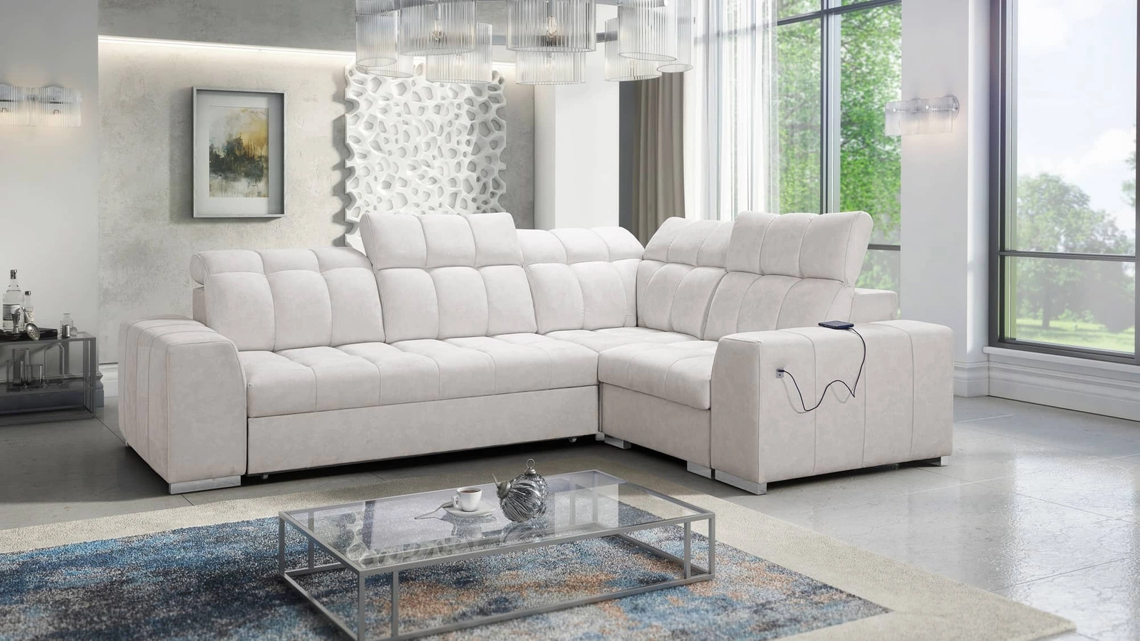 Dodatki tego mebla, które docenią wszyscy użytkownicy to pojemnik na pościel, funkcja spania oraz gniazdo ładowania USB w boczku narożnika.
