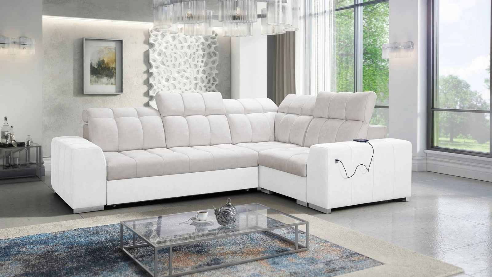 Dodatki tego mebla, które docenią wszyscy użytkownicy to pojemnik na pościel, funkcja spania oraz gniazdo ładowania USB w boczku narożnika.
