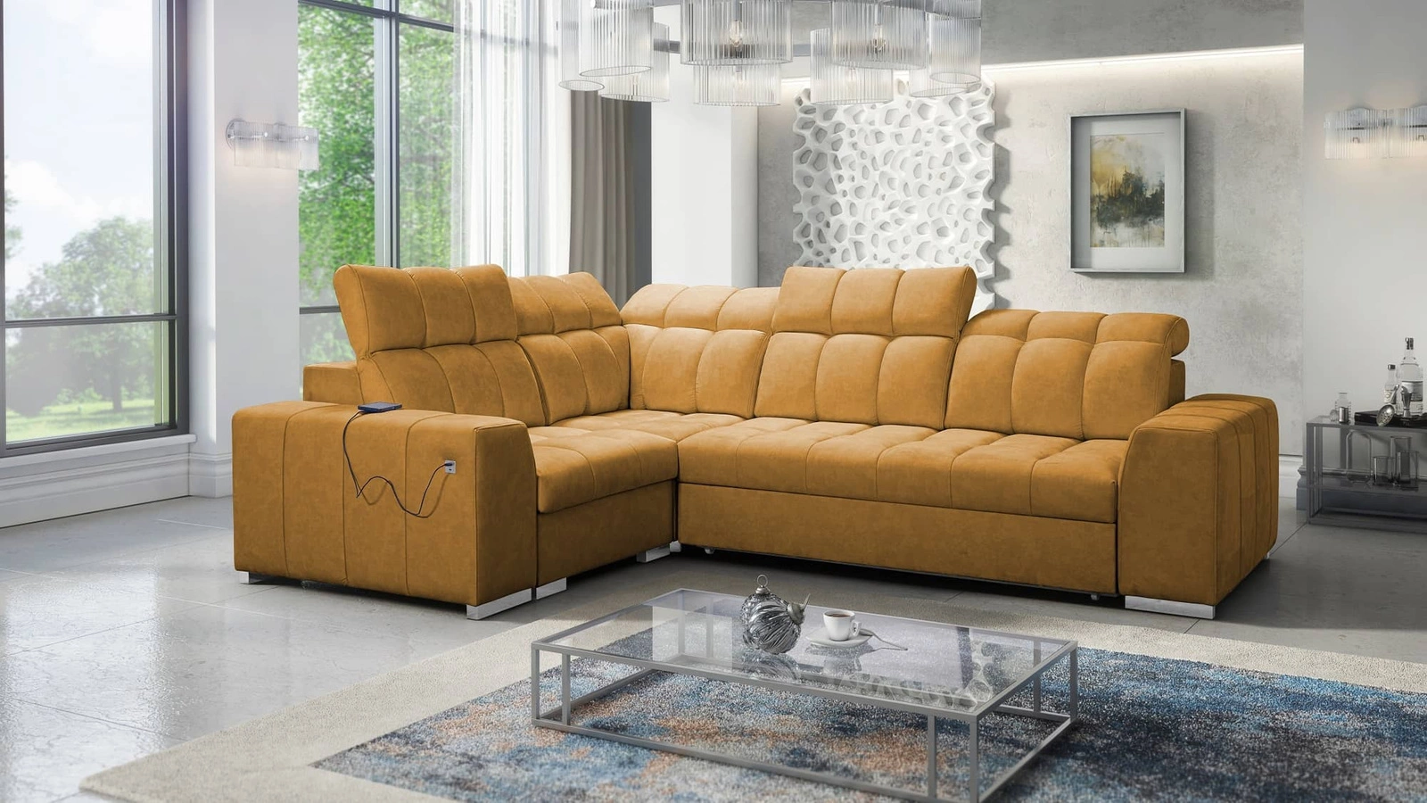 Narożnik Luigi II w kolorze miodowym z regulowanymi zagłówkami to zachwycający mebel z gwarancją najwyższego komfortu i funkcjonalności!