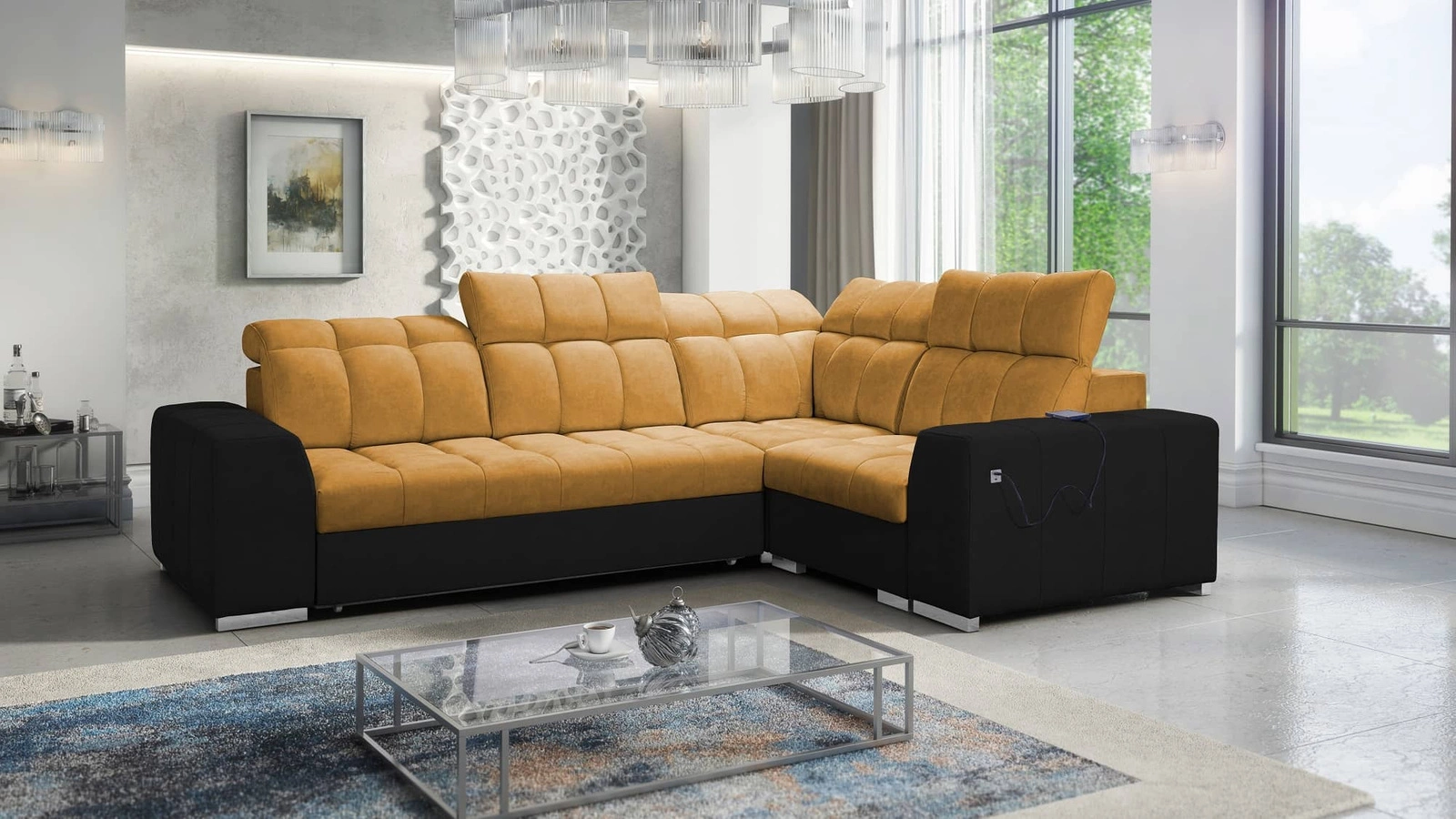 Narożnik z funkcją spania Luigi II miodowy / czarny prawostronny komfort podczas codziennego wypoczynku narożnik z pojemnikiem na pościel