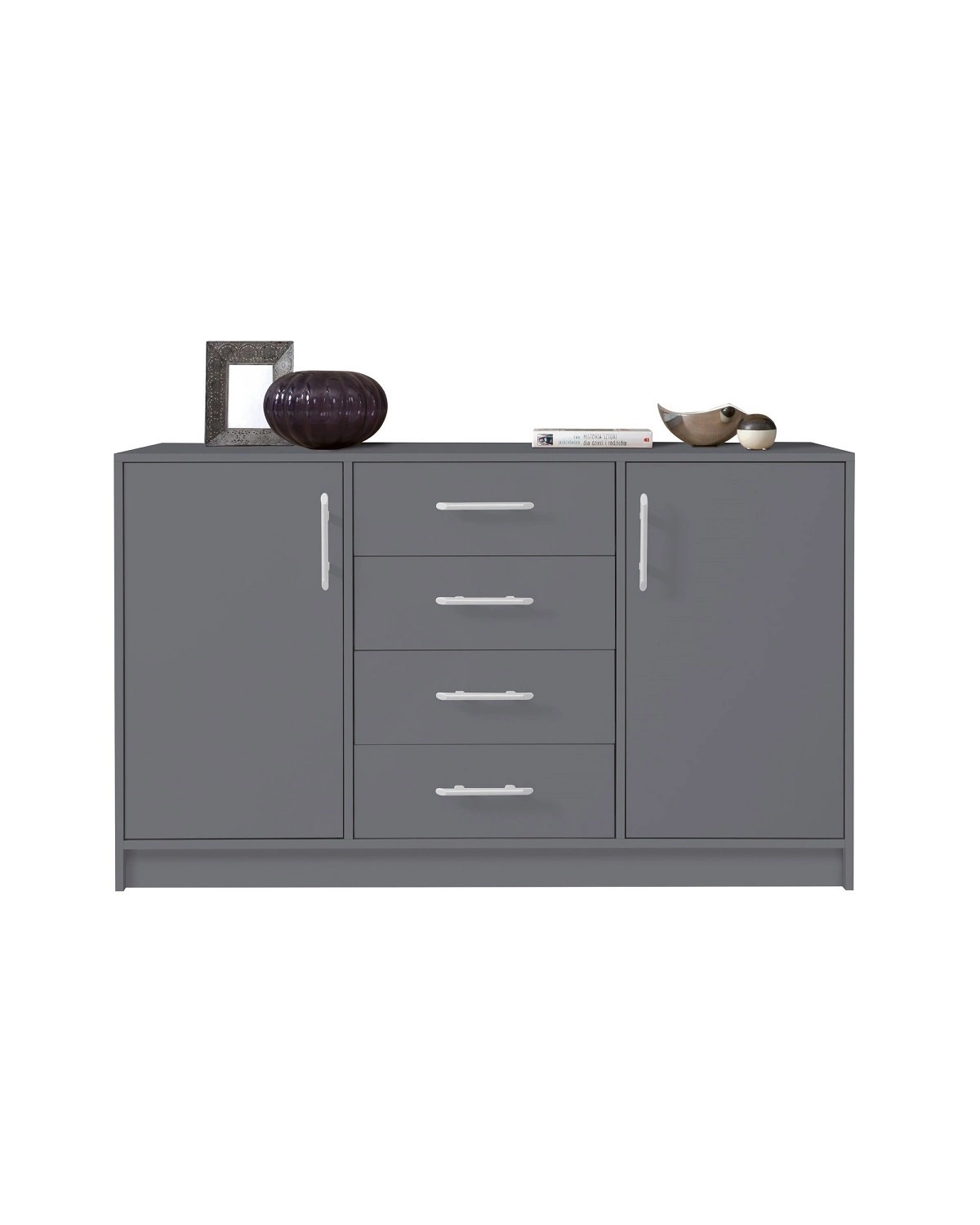 Komoda z kolekcji Caspe charakteryzuje się prostymi kształtami. Mebel skonstruowany jest z 2 drzwi i 4 szuflad wysuwanych na prowadnicach rolkowych. Dopełnieniem frontów komody są uchwyty aluminiowe.