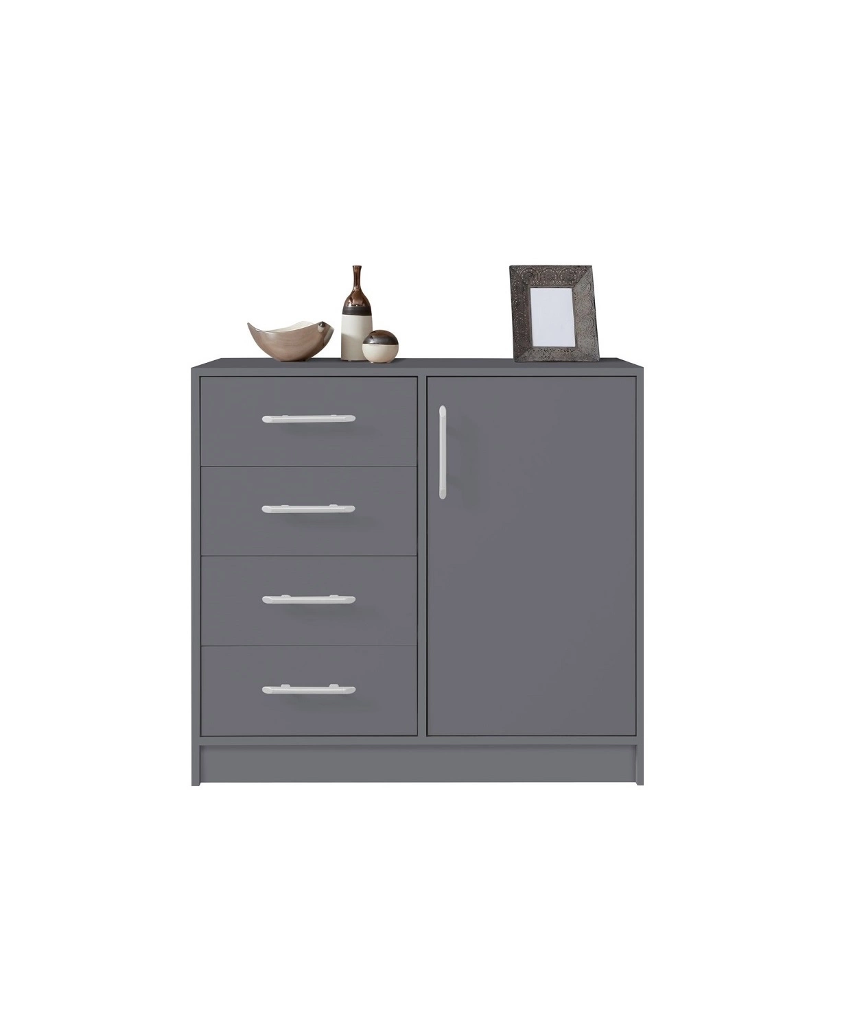 Komoda z kolekcji Caspe charakteryzuje się prostymi kształtami. Mebel skonstruowany jest z 1 drzwi i 4 szuflad wysuwanych na prowadnicach rolkowych. Dopełnieniem frontów komody są uchwyty aluminiowe.