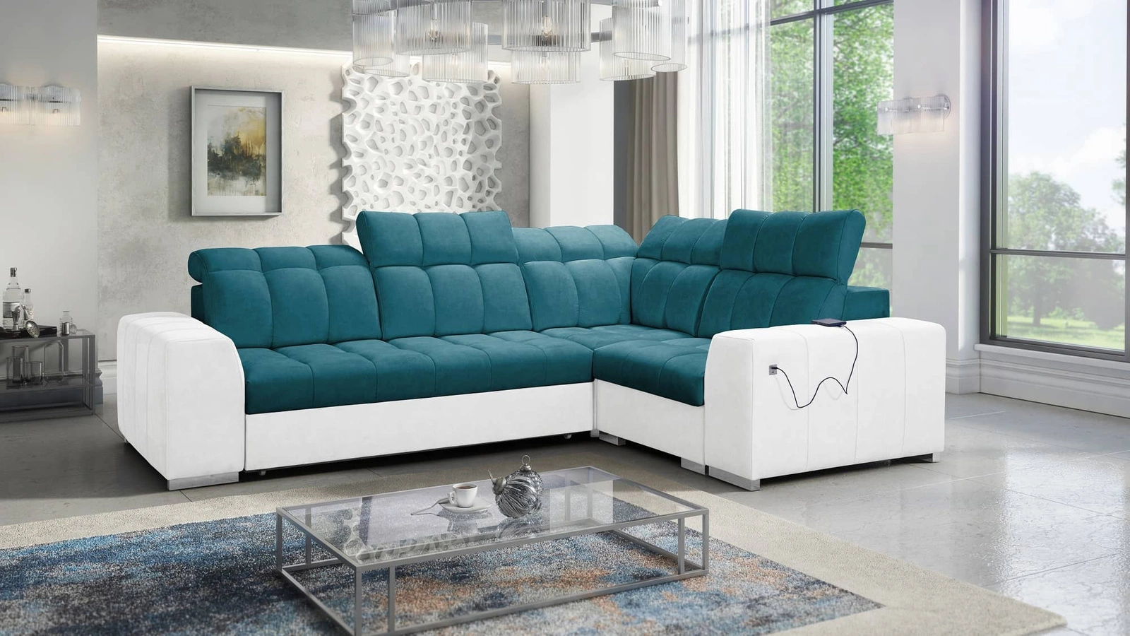 Narożnik Luigi II w kolorze turkusowym / biały z regulowanymi zagłówkami to zachwycający mebel z gwarancją najwyższego komfortu i funkcjonalności!