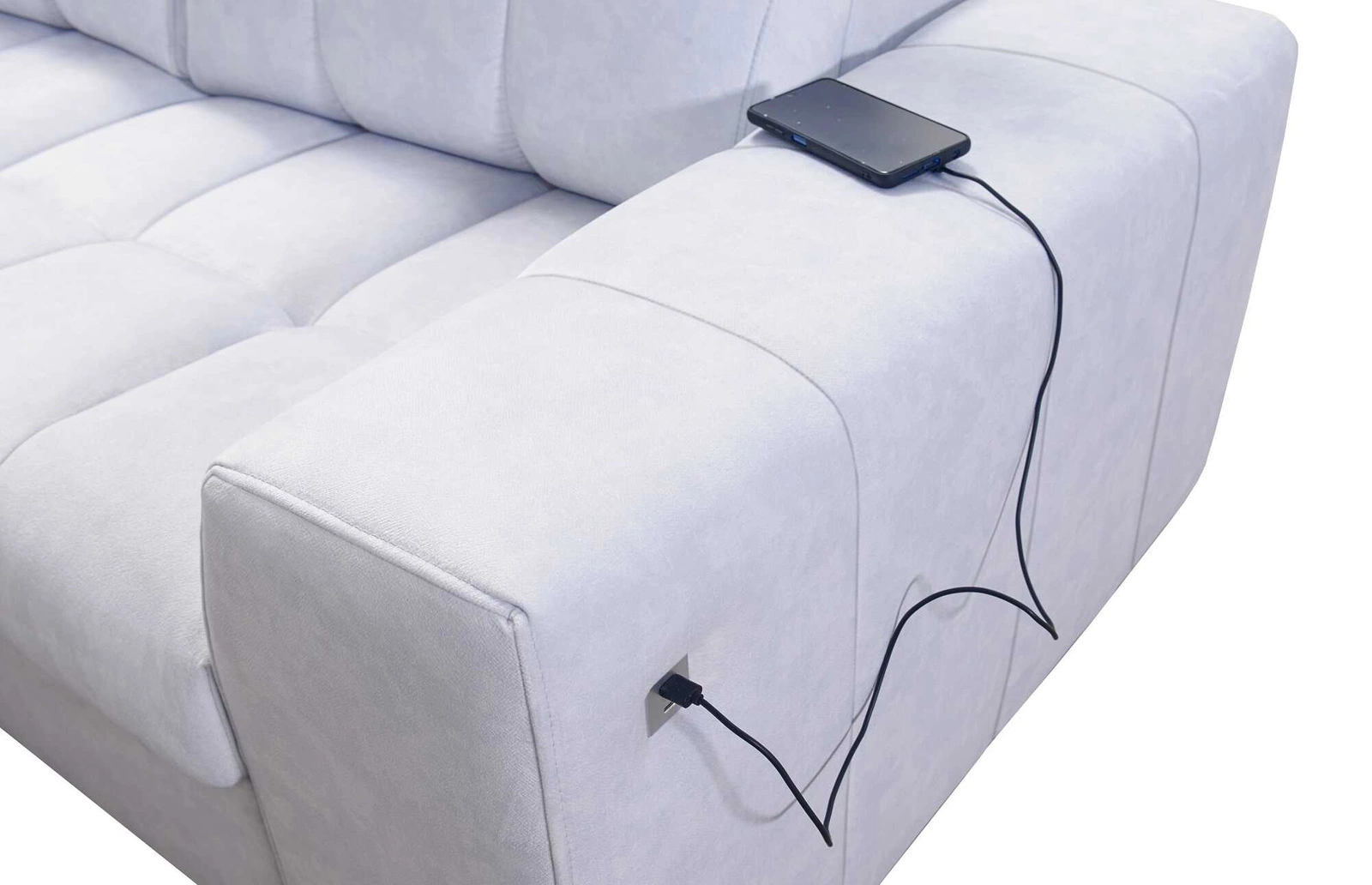 Dodatki tego mebla, które docenią wszyscy użytkownicy to pojemnik na pościel, funkcja spania oraz gniazdo ładowania USB w boczku narożnika.