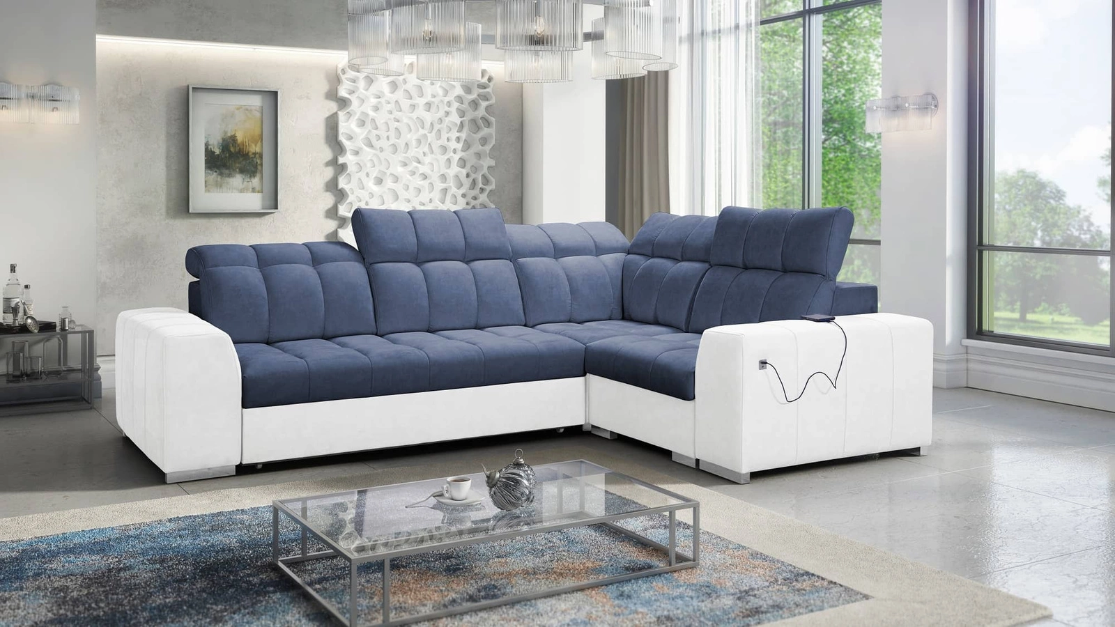 Narożnik Luigi II w kolorze niebieskim / biały z regulowanymi zagłówkami to zachwycający mebel z gwarancją najwyższego komfortu i funkcjonalności!