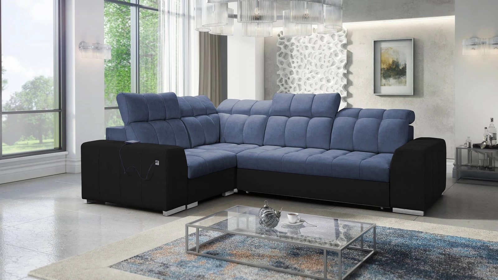 Narożnik Luigi II w kolorze niebieskim / czarny z regulowanymi zagłówkami to zachwycający mebel z gwarancją najwyższego komfortu i funkcjonalności!