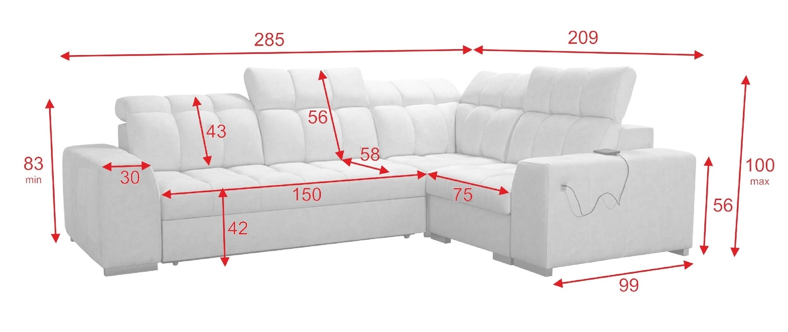 Wymiary mebla są optymalne. Szerokość narożnika 285 cm, wysokość maksymalna 100 cm oraz głębokość 209 cm. Powierzchnia spania narożnika wynosi 127x210 cm. Wysokość siedziska mebla to 42 cm a maksymalna wysokość oparcia wynosi 56 cm. Sprężyny faliste oraz pianka poliuretanowa T30 to materiał, z którego wykonane zostało siedzisko narożnika. Oparcie stałe z regulowanymi zagłówkami daje gwarancję wygodnego wypoczynku po długim dniu, które docenisz Ty, Twoi bliscy a także goście, którzy zasiądą na tym wyjątkowym narożniku!