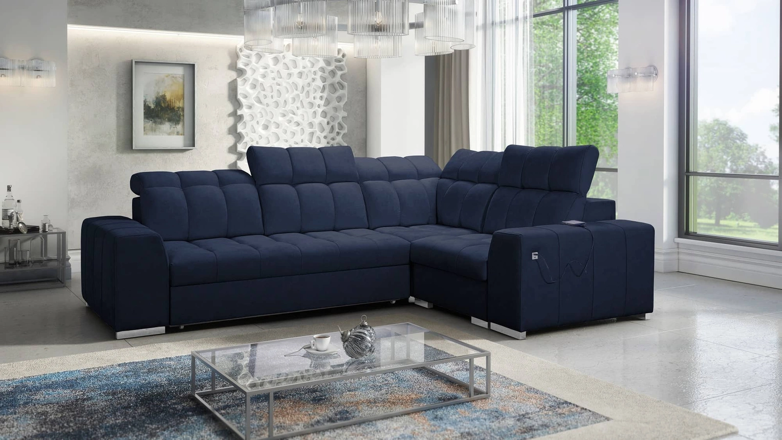 Narożnik Luigi II w kolorze granatowym z regulowanymi zagłówkami to zachwycający mebel z gwarancją najwyższego komfortu i funkcjonalności!